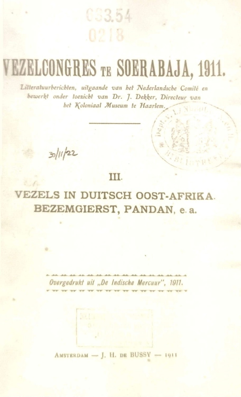 Vezelcongres te Soerabaja, 1911 : III. Vezels in duitsch Oost-Afrika. Bezemgierst, pandan, e.a. / K.....