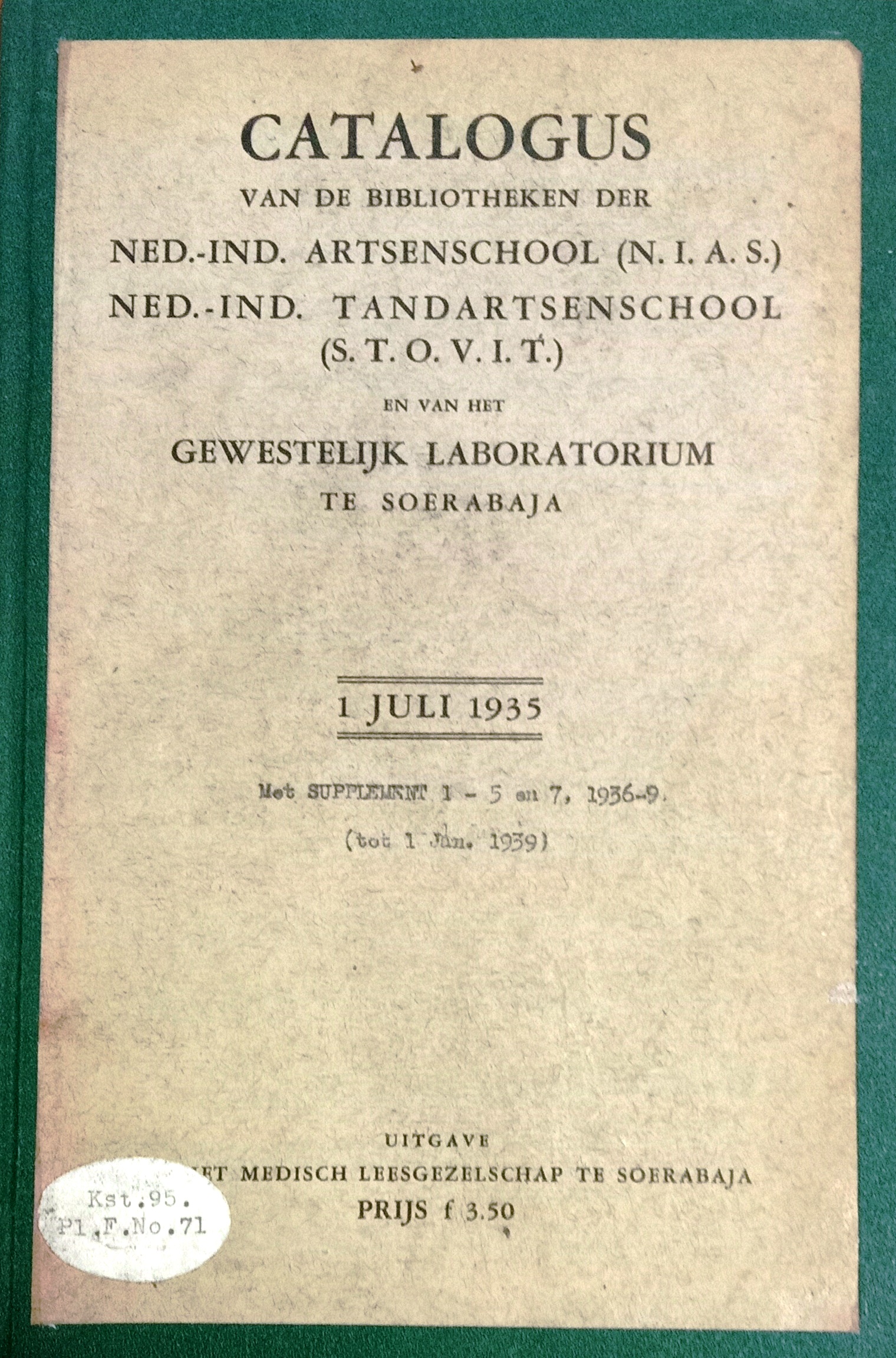 | Judul | Catalogus van de bibliotheken der Ned Ind artenschool (NIAS) Ned Ind tandartsenschool (STOVIT) en van het gewestelijk laboratorium te Soerabaja : 1 Juli 1935 / STOVIT |