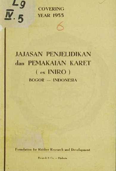 | Catatan | Berisi Laporan Tahunan Jajasan Penjelidikan dan Pemakaian Karet (ex INIRO) Bogor-Indonesia tahun 1955, 1956, 1957,1958, 1959, 1960 |