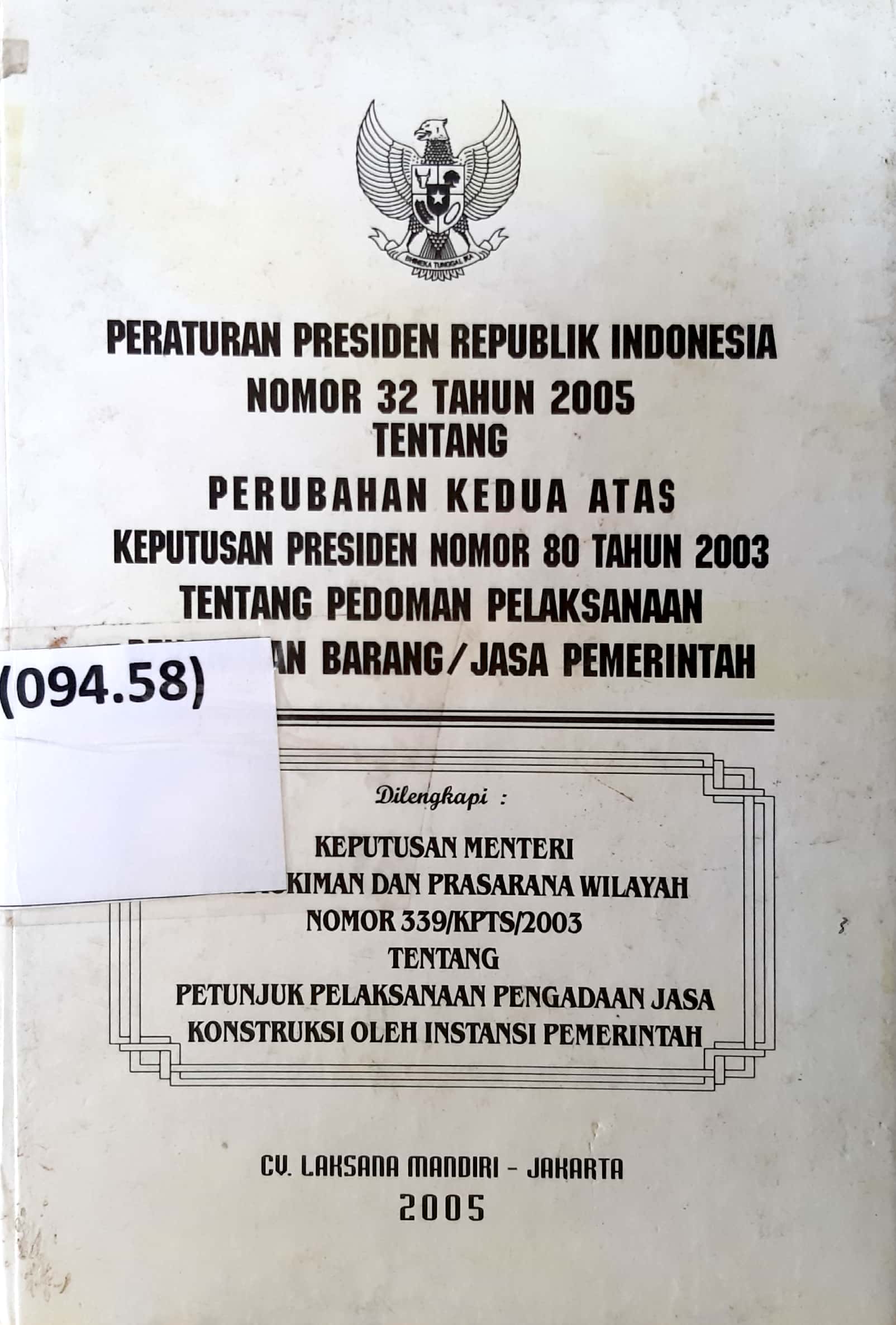 Judul | Peraturan Presiden Republik Indonesia Nomor 32 Tahun 2005 Tentang : Perubahan Kedua Atas Keputusan Presiden Nomor 80 Tahun 2003 Tentang Pedoman Pelaksanaan Pengadaan Barang/Jasa Pemerintah |