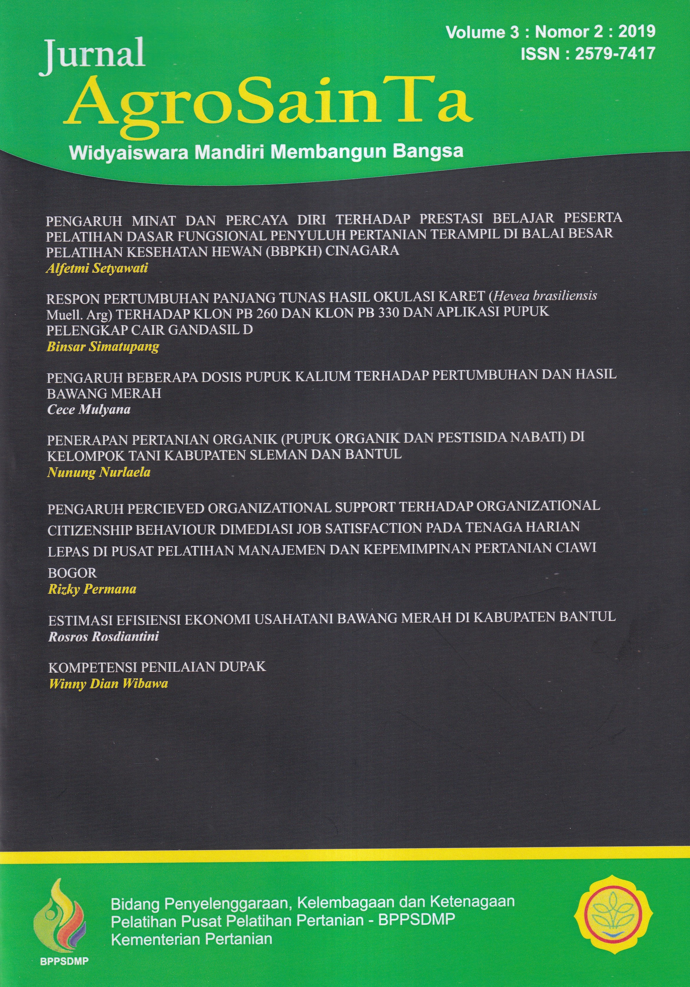 Jurnal agrosainta volume 3 nomor 2, 2019 : widyaiswara mandiri membangun bangsa / Kepala Pusat Pela....
