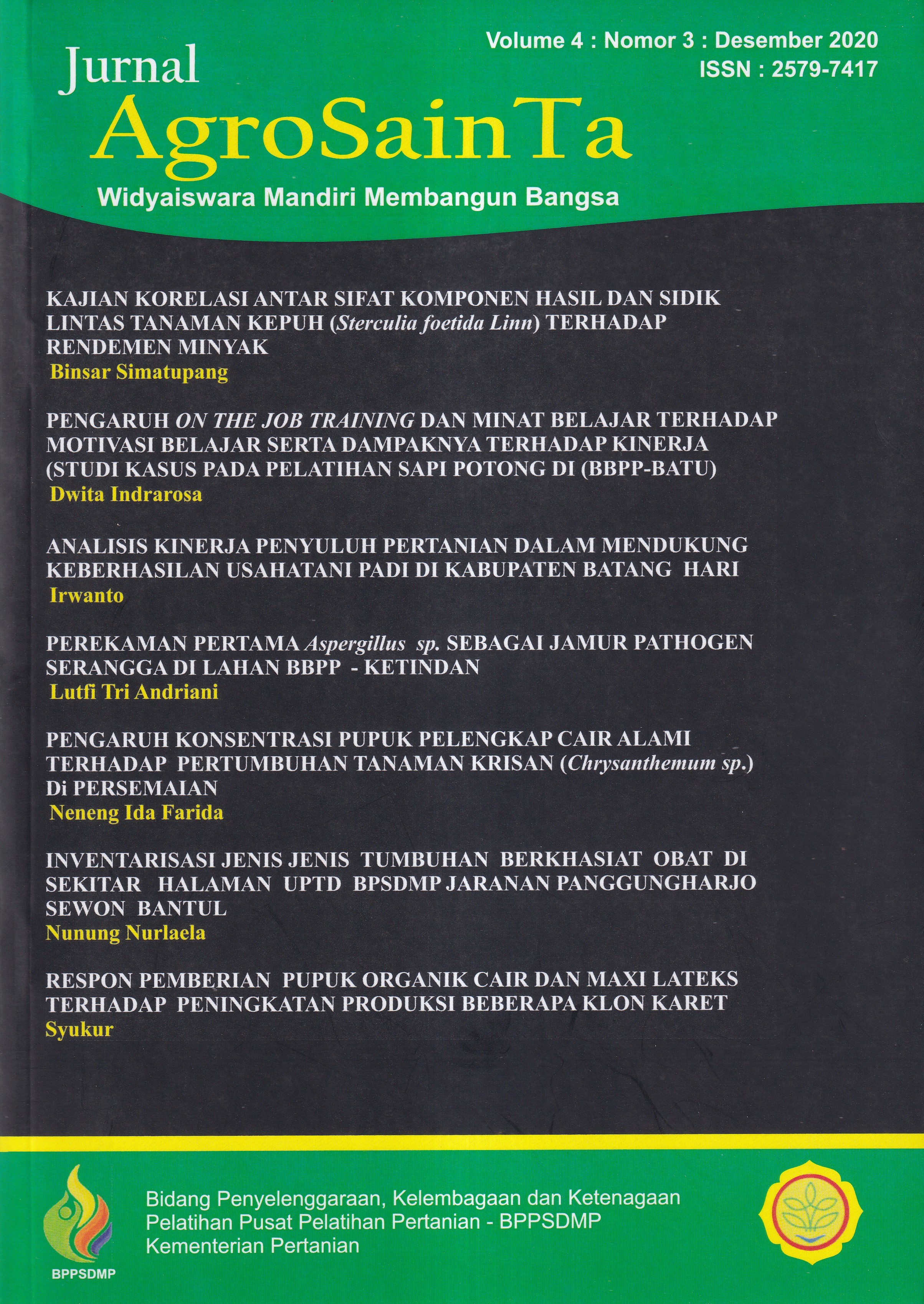 Jurnal agrosainta volume 4 nomor 3, Desember 2020 : widyaiswara mandiri membangun bangsa / Kepala P....