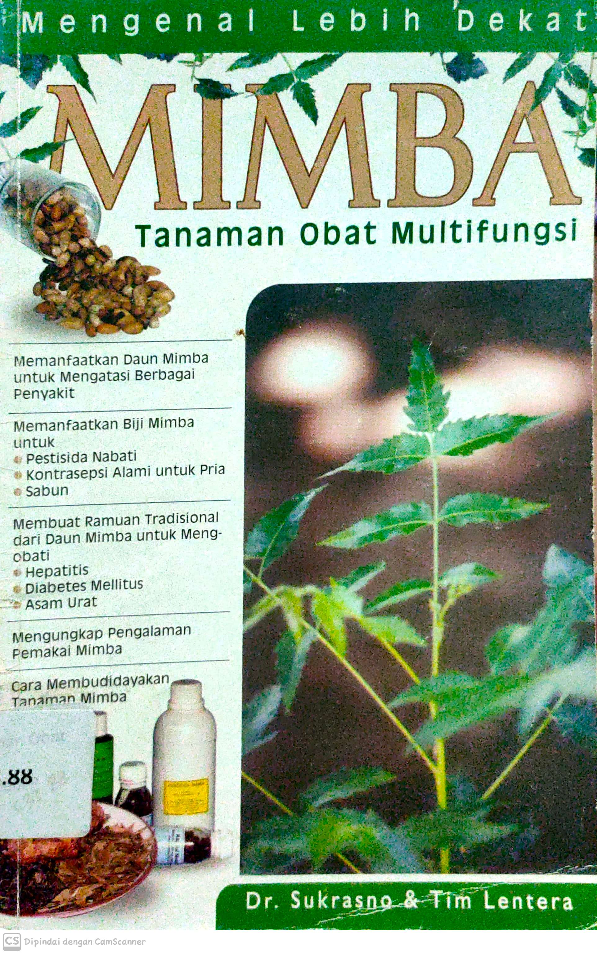 520 | # | # | $a Mimba (Azadirachta indica A. juss) dijuluki sebagai wonderful tree oleh seorang ahli mimba asal Jerman. Julukan ini muncul karena mimba memiliki banyak fungsi serta hamper seluruh bagian tanamannya bisa dimanfaatkan untuk aneka tujuan. Aunnya bisa digunakan sebagai obat tradisional;bijinya bisa dimanfaatkan untuk membuat pestisida nabati ramah lingkungan,sabun,dan sampo; batangnya untuk bahan bangunan; dan rantingnya untuk tusuk gigi. Selain memaparkan sosok tanaman mimba buku ini memuat cara memanfaatkan dan membudidayakannya. |