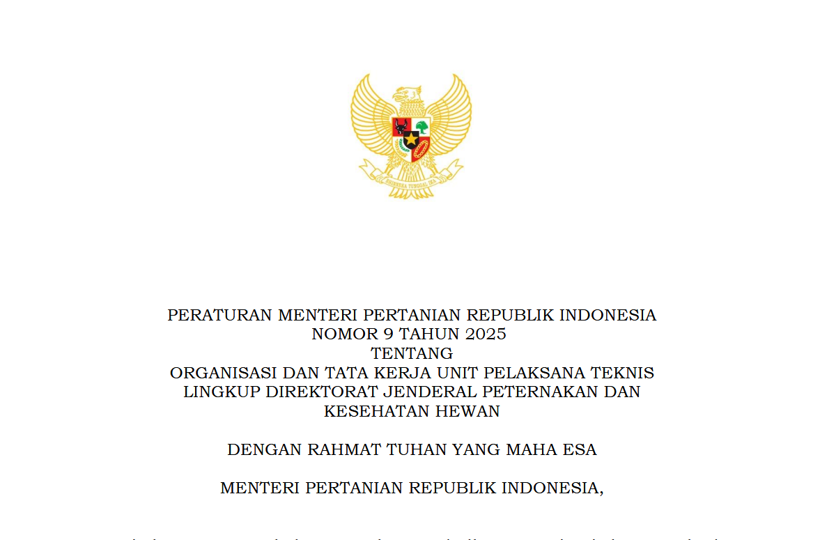 | Judul | Peraturan Menteri Pertanian Republik Indonesia Nomor 9 Tahun 2025 Tentang Organisasi dan Tata Kerja Unit Pelaksana Teknis Lingkup Direktorat Jenderal Peternakan dan Kesehatan Hewan |