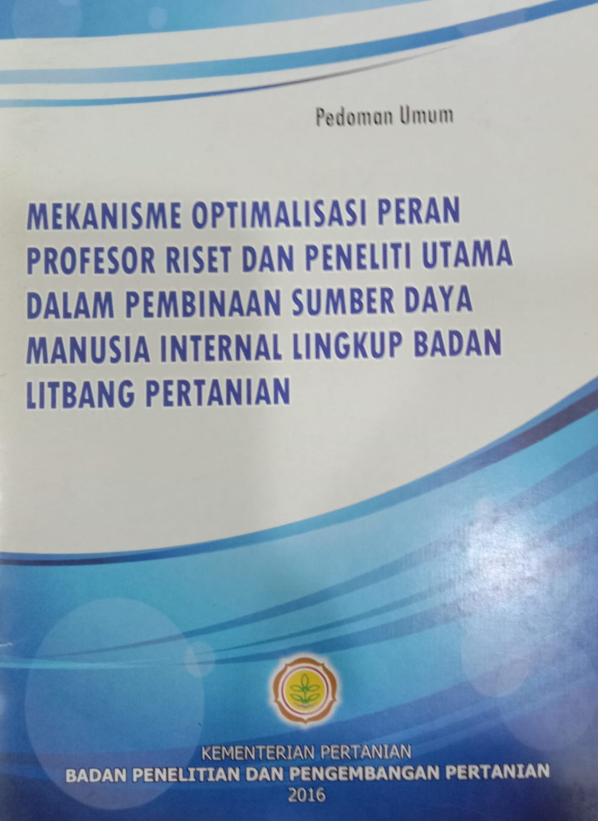 | Judul | Panduan umum Mekanisme Optimalisasi Peran Profesor Riset dan Peneliti Utama dalam Pembinaan Sumber Daya Manusia Internal lingkup Badan Litbang Pertanian / Balitbangtan |