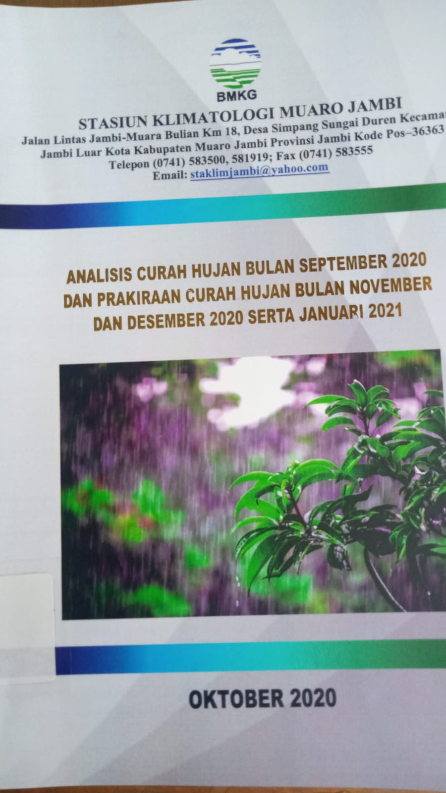 | Judul | Analisis Curah Hujan Bulan September 2020 dan Prakiraan Curah Hujan Bulan November dan Desember 2020 Seta Januari 2021 / Trisaputra Rudi Anuar Yudha |