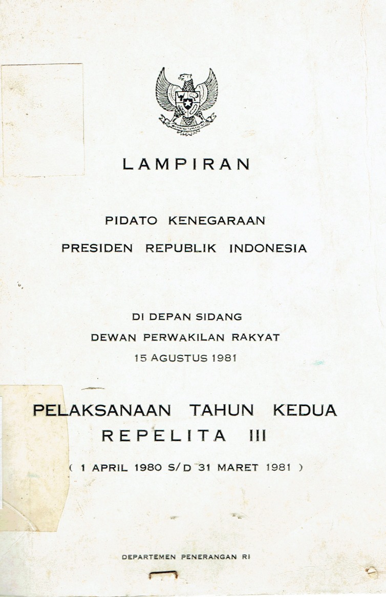 | Judul | Lampiran Pidato Kenegaraan Presiden Republik Indonesia di Depan Sidang Dewan Perwakilan Rakyat 15 Agustus 1981 : Pelaksanaan Tahun Kedua Repelita III (1 April 1980 s/d 31 Maret 1981) |