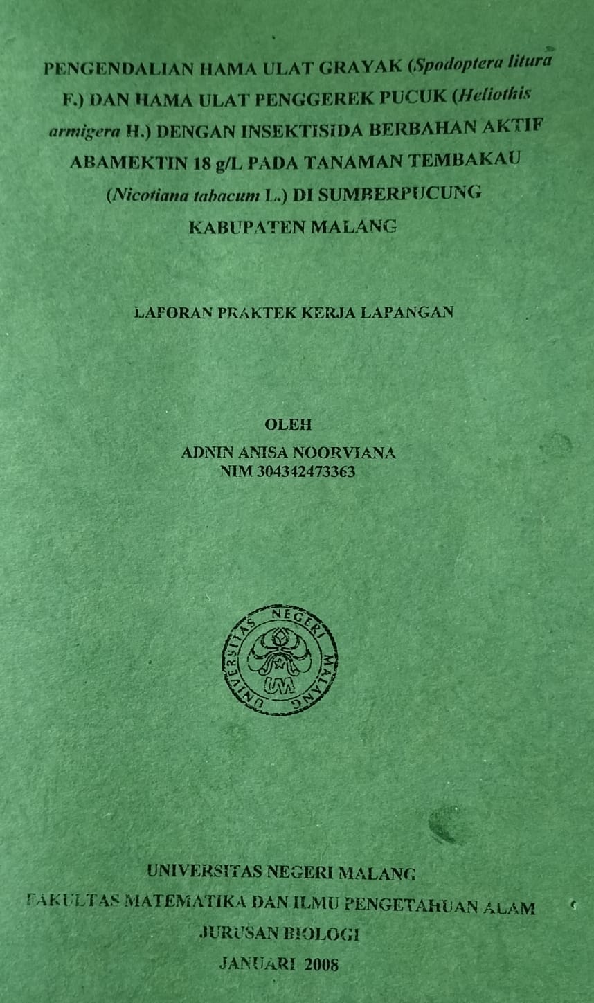 | Judul | Pengendalian Hama Ulat Grayak dan Hama Pengerek Pucuk Dengan Insektisida Berbahan Aktif Abamektin 18 g/L Pada Tanaman Tembakau di Sumberpucung Kabupaten Malang |