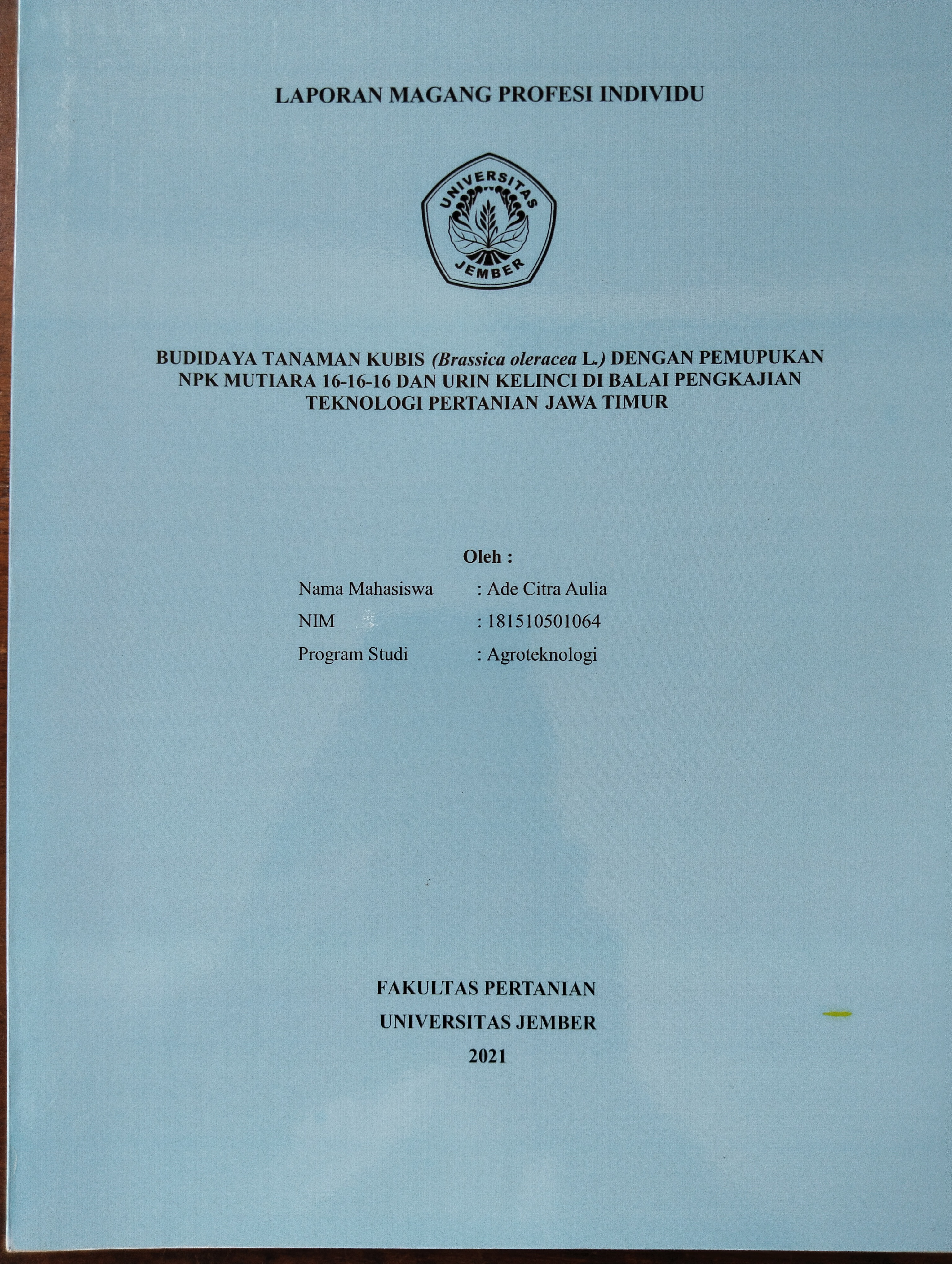 | Judul | Laporan Magang Profesi Individu Budidaya Tanaman Kubis (Brassica oleracea L.) Dengan Pemupukan NPK Mutiara 16-16-16 Dan Urin Kelinci Di Balai Pengkajian Teknologi Pertanian Jawa Timur |