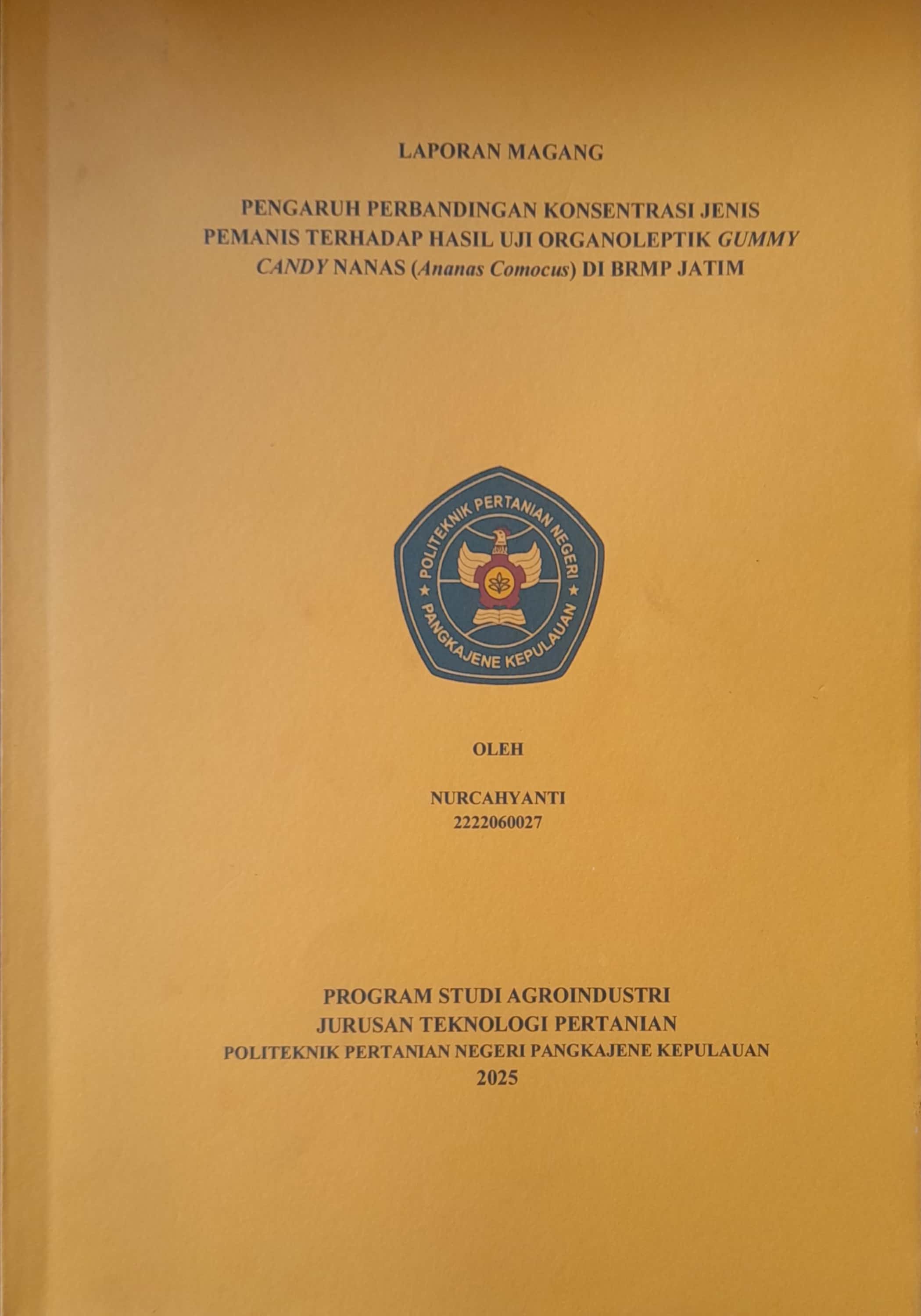 | Judul | Pengaruh Perbandingan Konsentari jenis Pemanis Terhadap Hasil Uji Organoleptik Gummy Candy Nanas (Ananas comocus) Di BRMP JATIM |