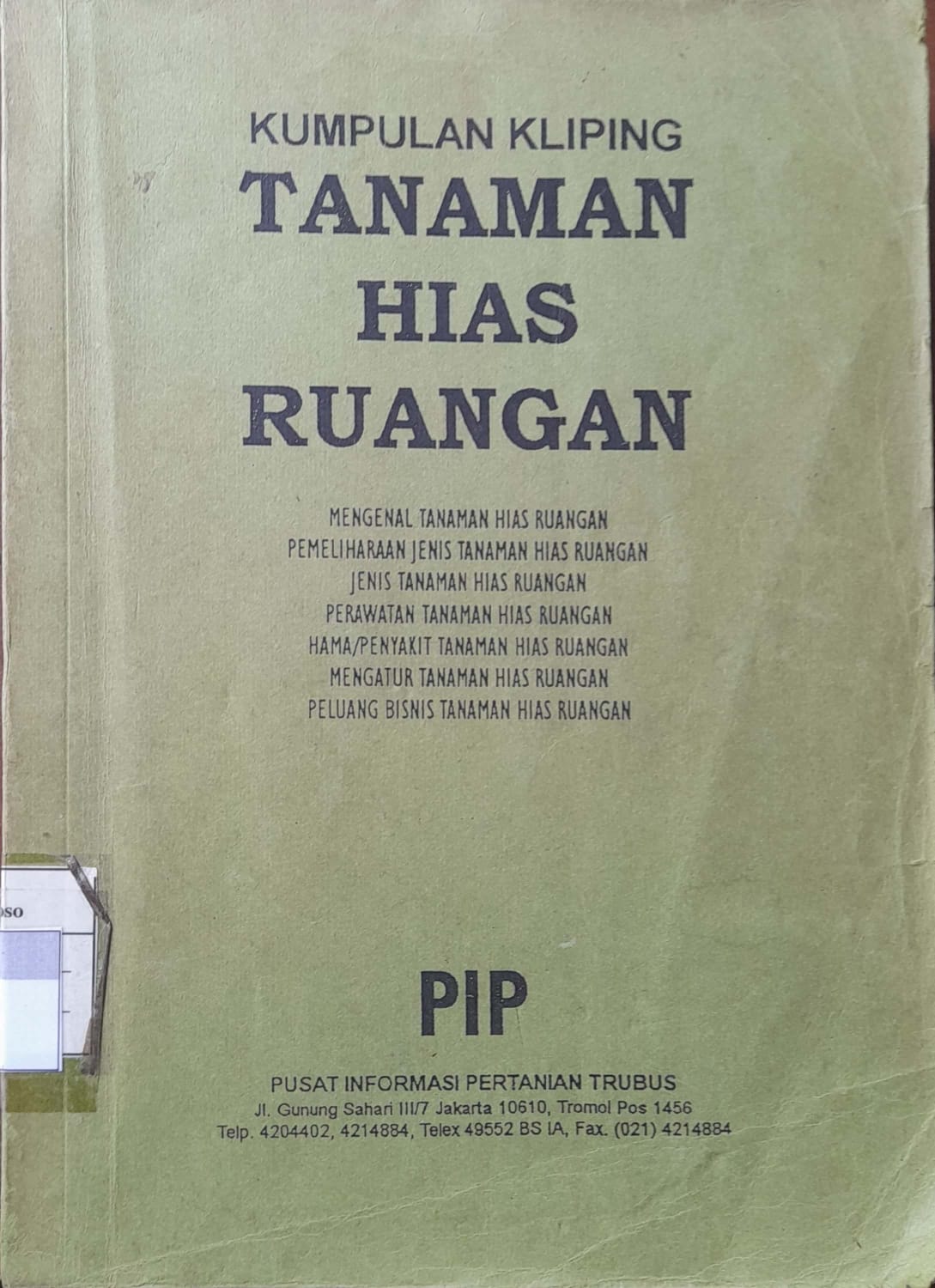 | Judul | Kumpulan Kliping Tanaman Hias Ruangan ( Mengenal Tanaman Hias Ruangan, Pemeliharaan Jenis Tanaman Ruangan, Jenis Tanaman Hias Ruangan, Hama/Penyakit Tanaman Hias Ruangan, Mengatur Tanaman Hias Ruangan, Peluang Bisnis Tanaman Hias Ruangan)) |