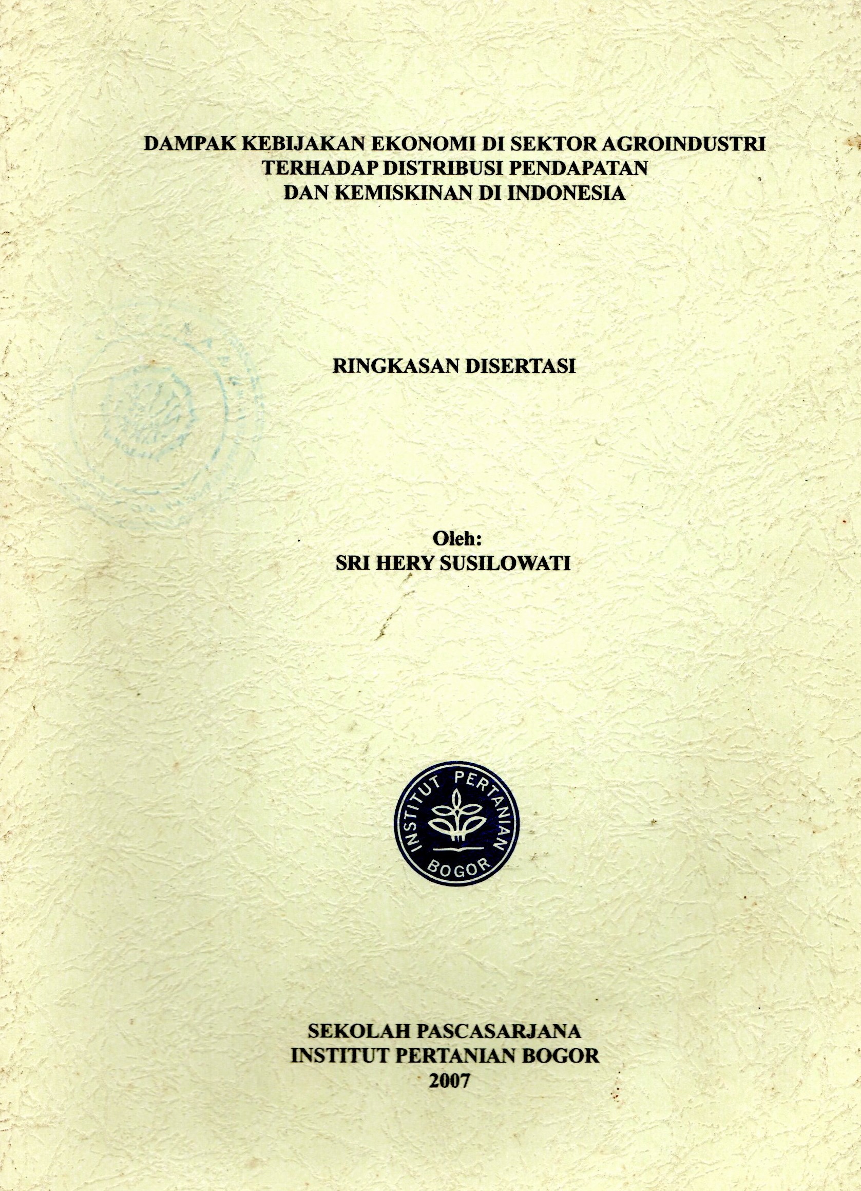 $a Dampak kebijakan ekonomi di sektor agroindustri terhadap distribusi pendapatan dan kemiskinan di Indonesia : $b Ringkasan Disertasi /$c Sri Hery Susilowati