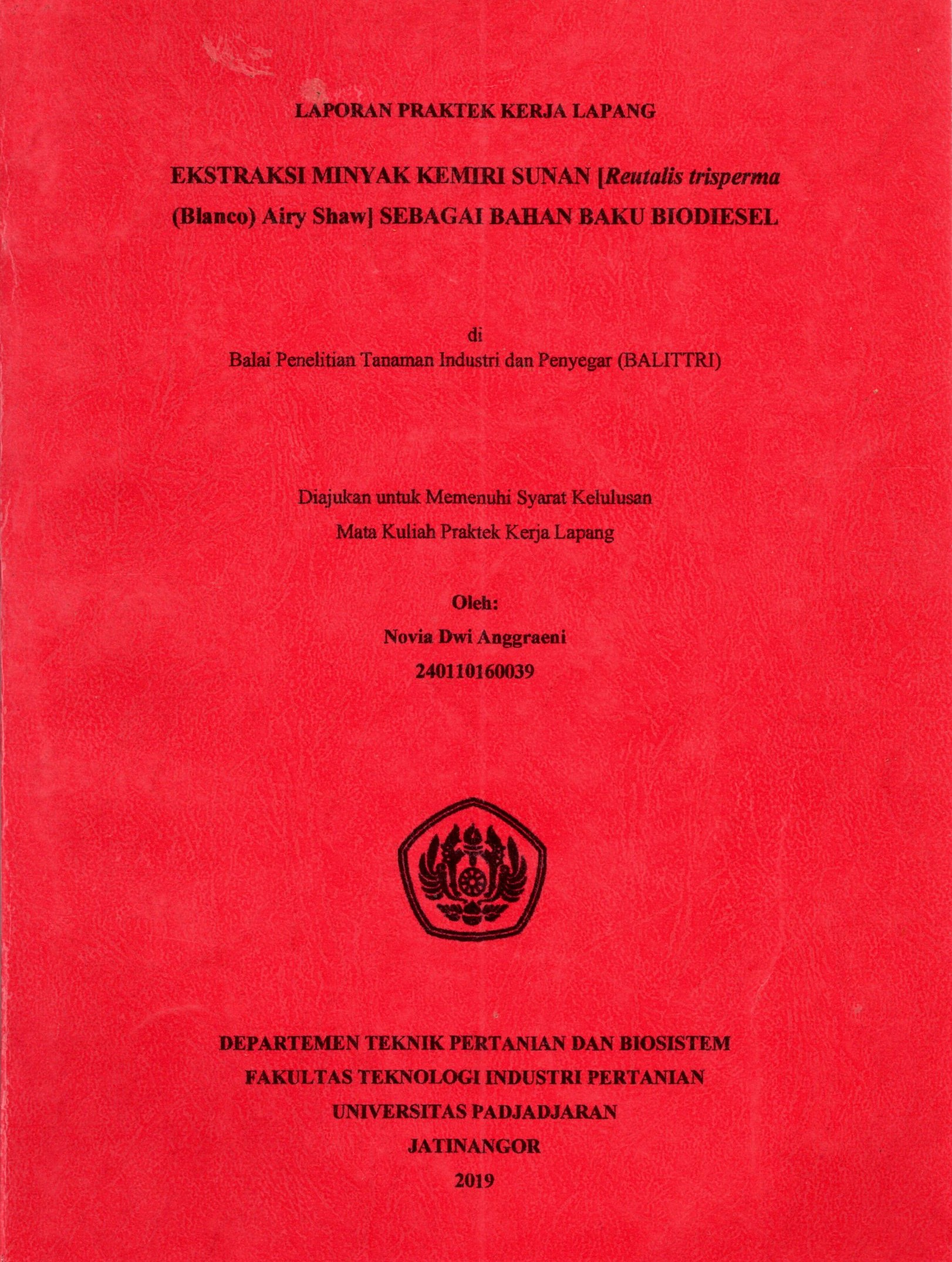 | Judul | Ekstraksi minyak kemiri sunan (Reutealis trisperma (Blanco) Airy Shaw) sebagai bahan baku biodiesel : laporan praktek kerja lapang / Novia Dwi Anggraeni |