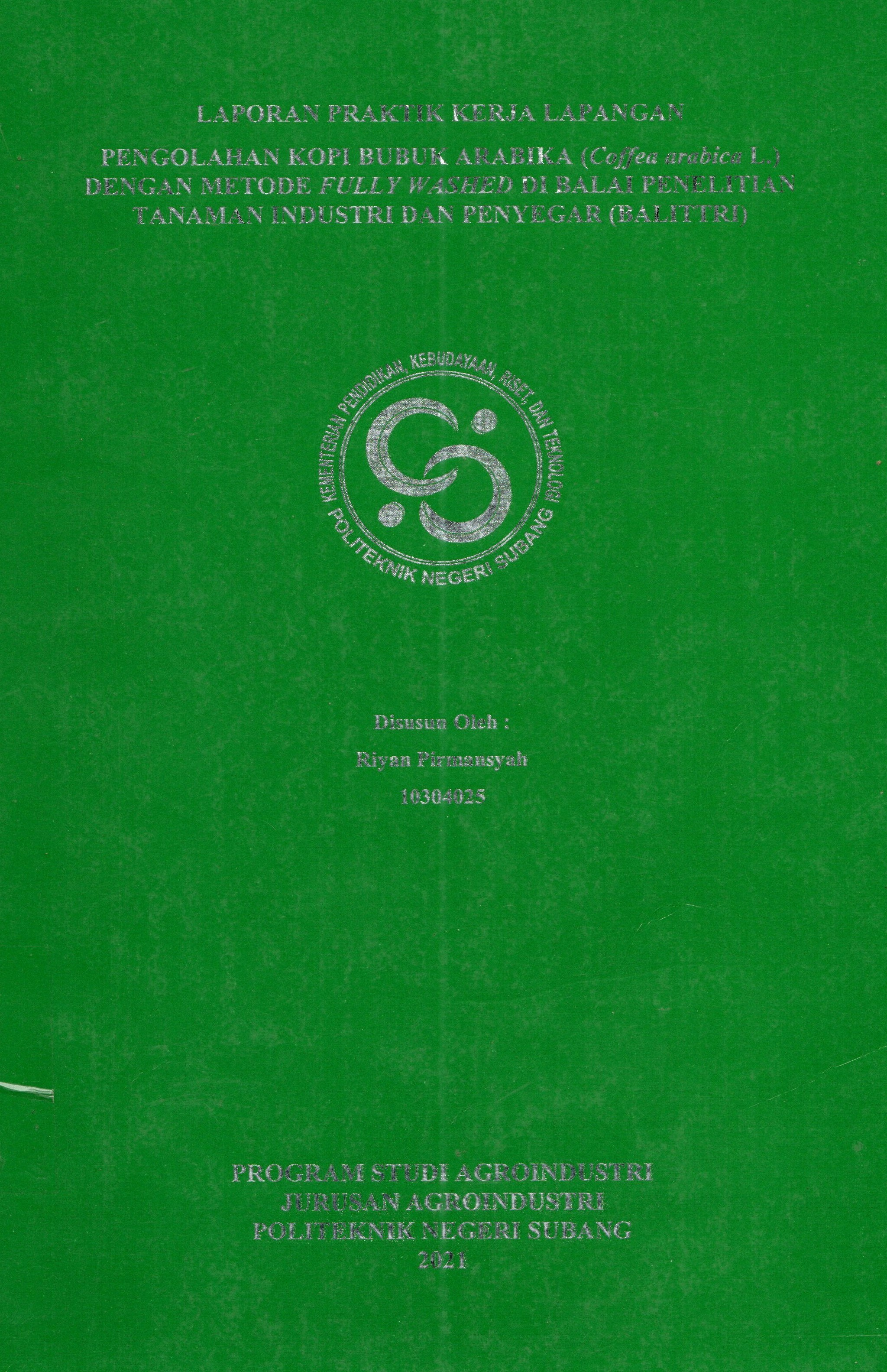$a Pengolahan kopi bubuk arabika (Coffea arabica L.) dengan metode Fully Washed di Balai Penelitian Tanaman Industri dan Penyegar (Balittri) : $b Laporan praktek kerja lapangan /$c Riyan Pirmansyah