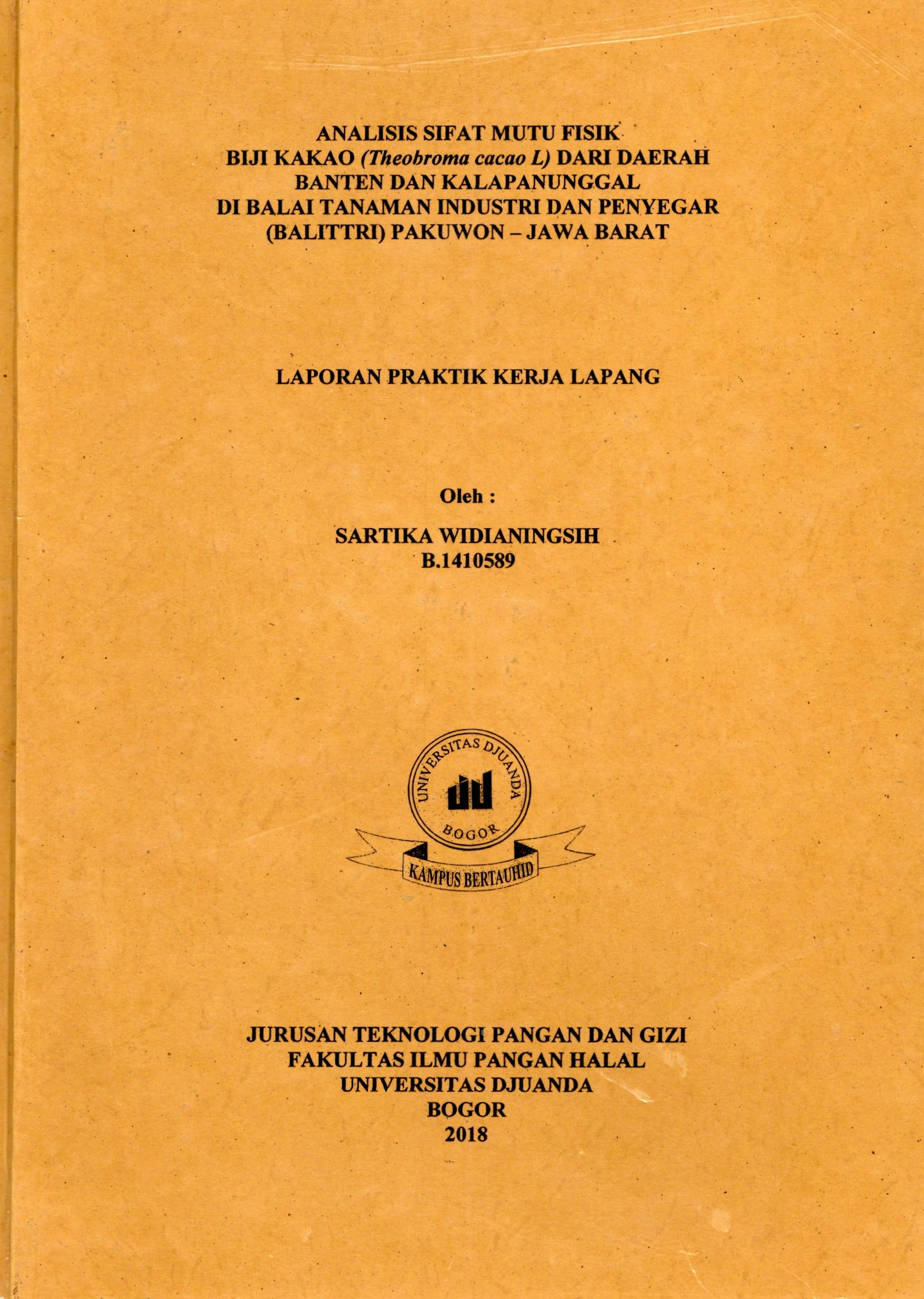 $a Analisis sifat mutu fisik biji kakao (Theobroma cacao L.) dari daerah Banten dan Kalapanunggal di Balai Tanaman Industri dan Penyegar (BALITTRI) Pakuwon-Jawa Barat : $b Laporan praktek kerja lapangan /$c Sartika Widianingsih