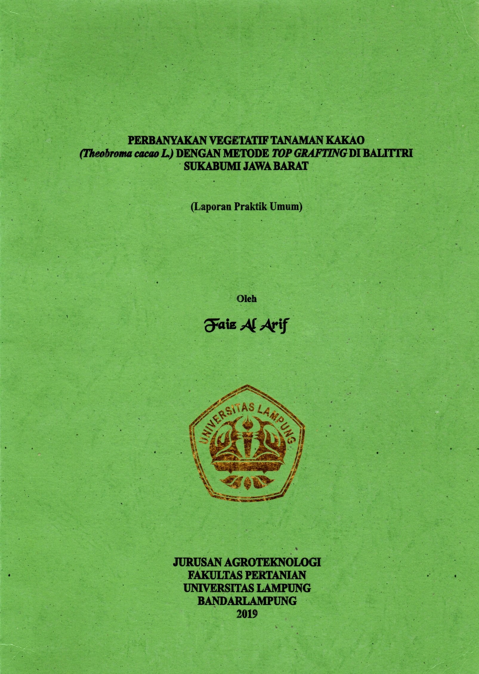 | Judul | Perbanyakan vegetatif tanaman kakao (Theobroma cocoa L.) dengan Metode Top Grafting di BALITTRI Sukabumi Jawa Barat : Laporan praktik umum / Faiz Al Arif |