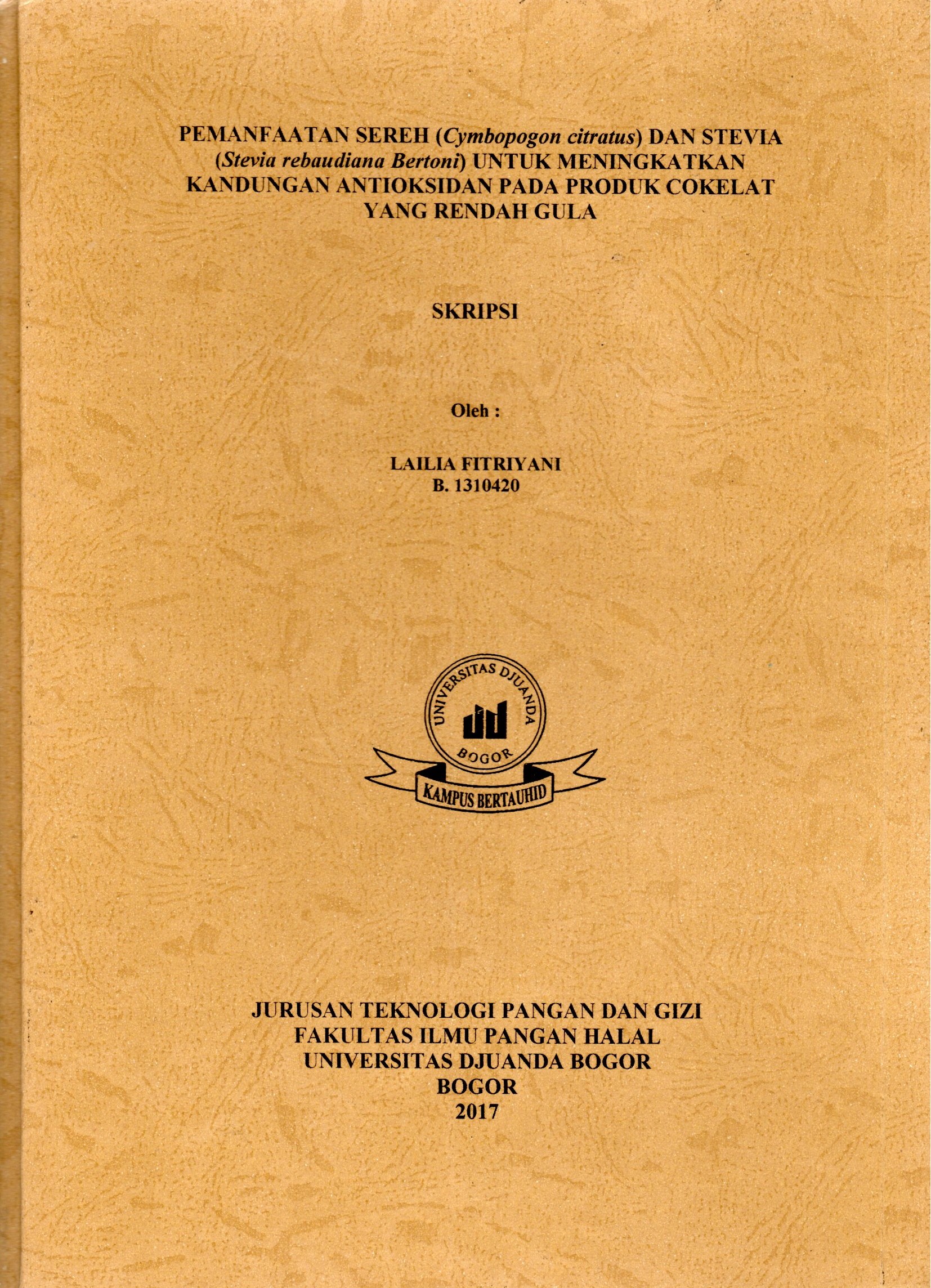 | Judul | Pemanfaatan sereh (Cymbopogon ciratus) dan stevia (Stevia rebaudiana bertoni) untuk meningkatkan kandungan antioksidan pada produk cokelat yang rendah gula : skripsi |