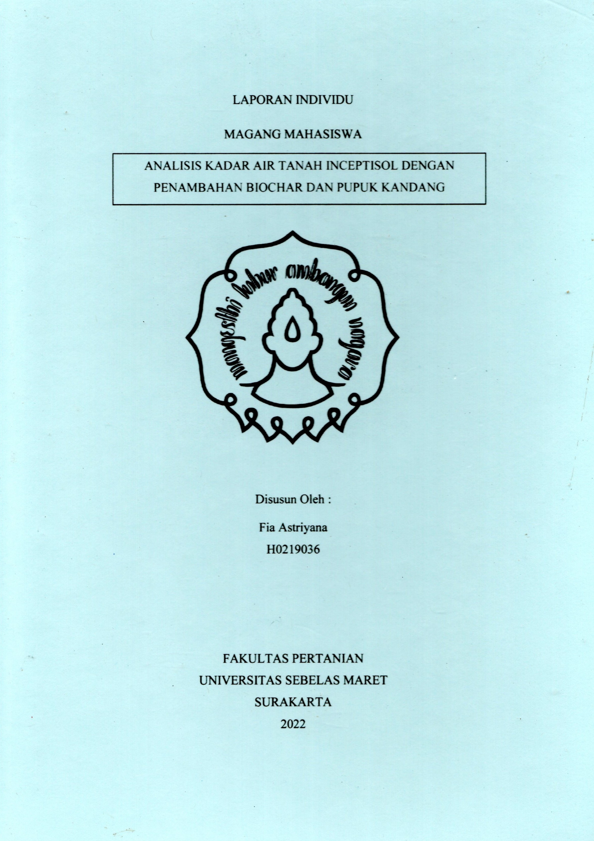 | Judul | Analisis kadar air tanah inceptisol dengan penambahan biochar dan pupuk kandang : laporan individu magang mahasiswa / Fia Astriyana |