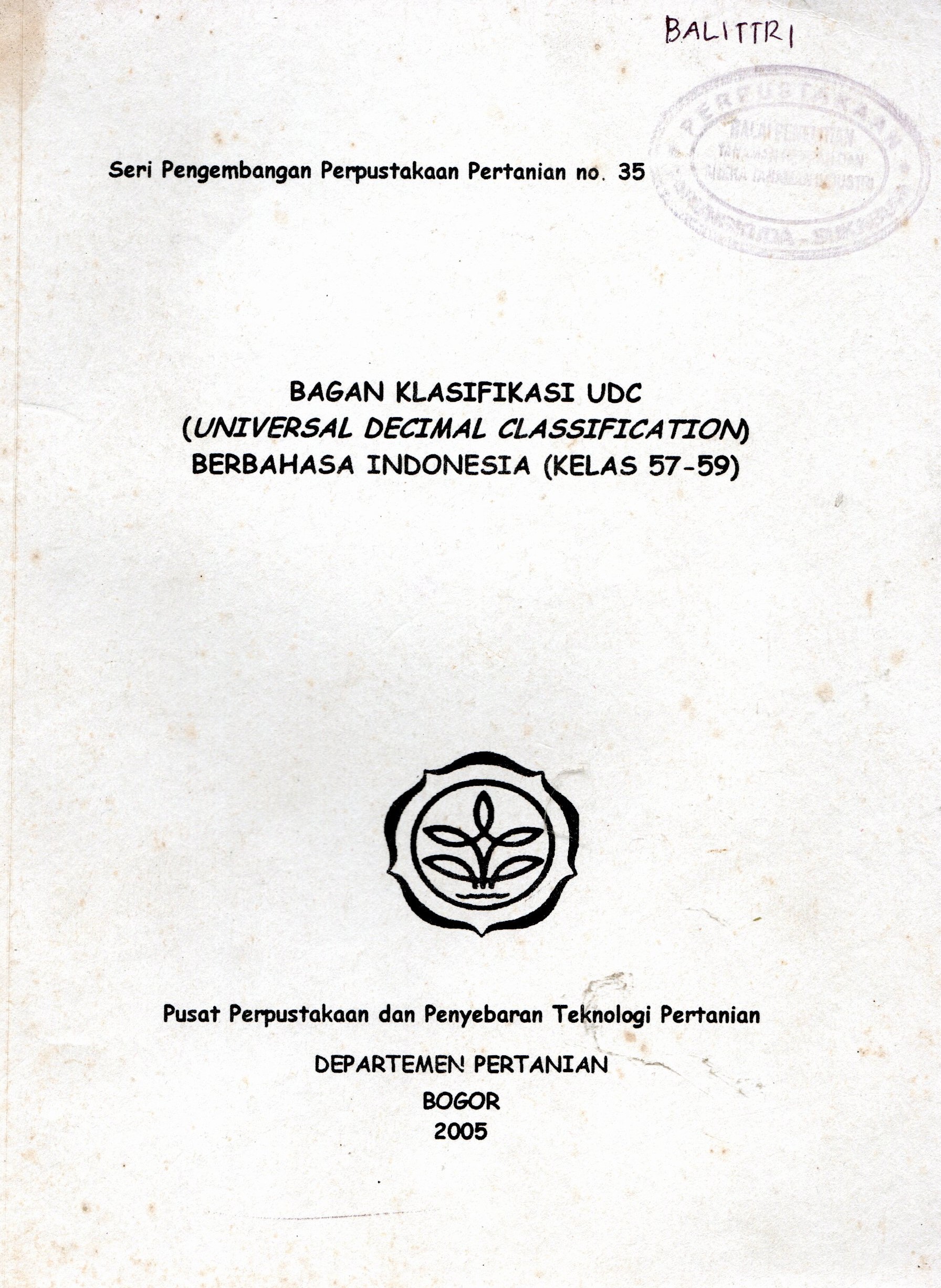 | Judul | Bagan klasifikasi udc (Universal decimal classification) berbahasa Indonesia (kelas 57-59) : Seri pengembangan perpustakaan pertanian no. 35 |
