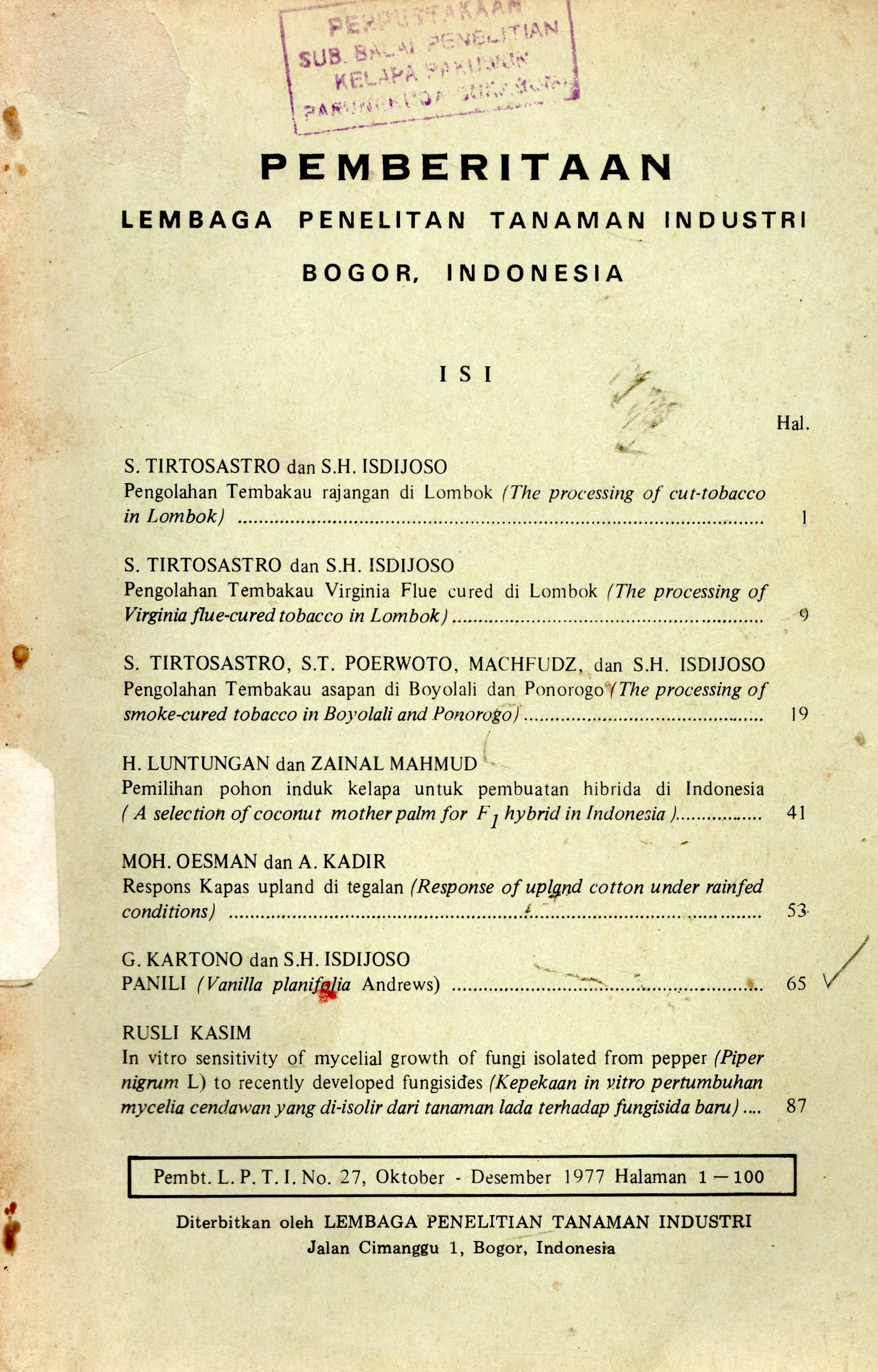 | Penerbitan | Bogor : Lembaga Penelitian Tanaman Industri, 1977 |
