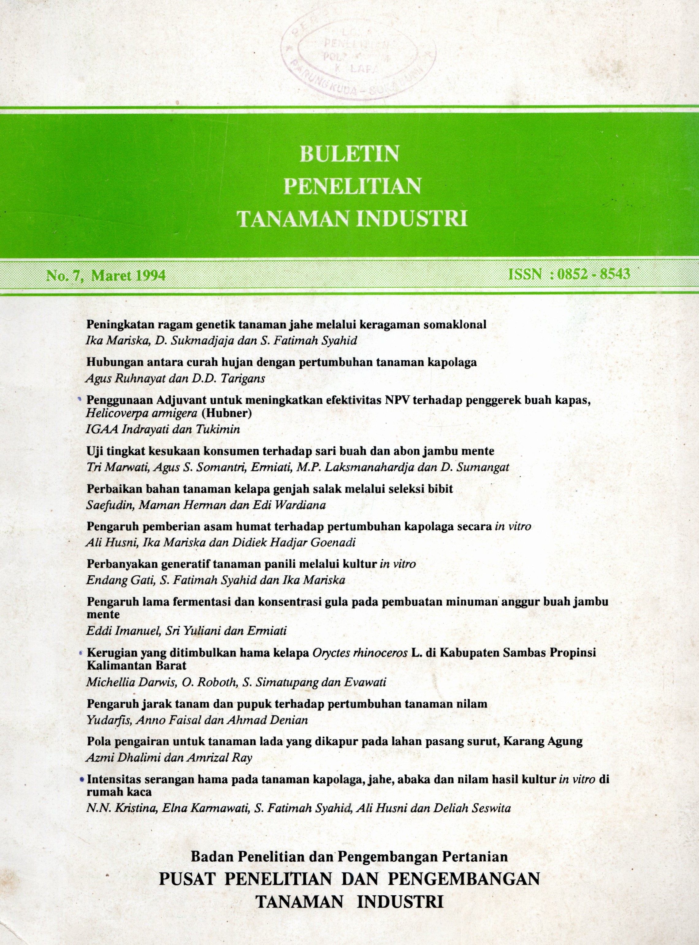 | Penerbitan | Bogor : Pusat Penelitian dan Pengembangan Tanaman Industri, 1994 |