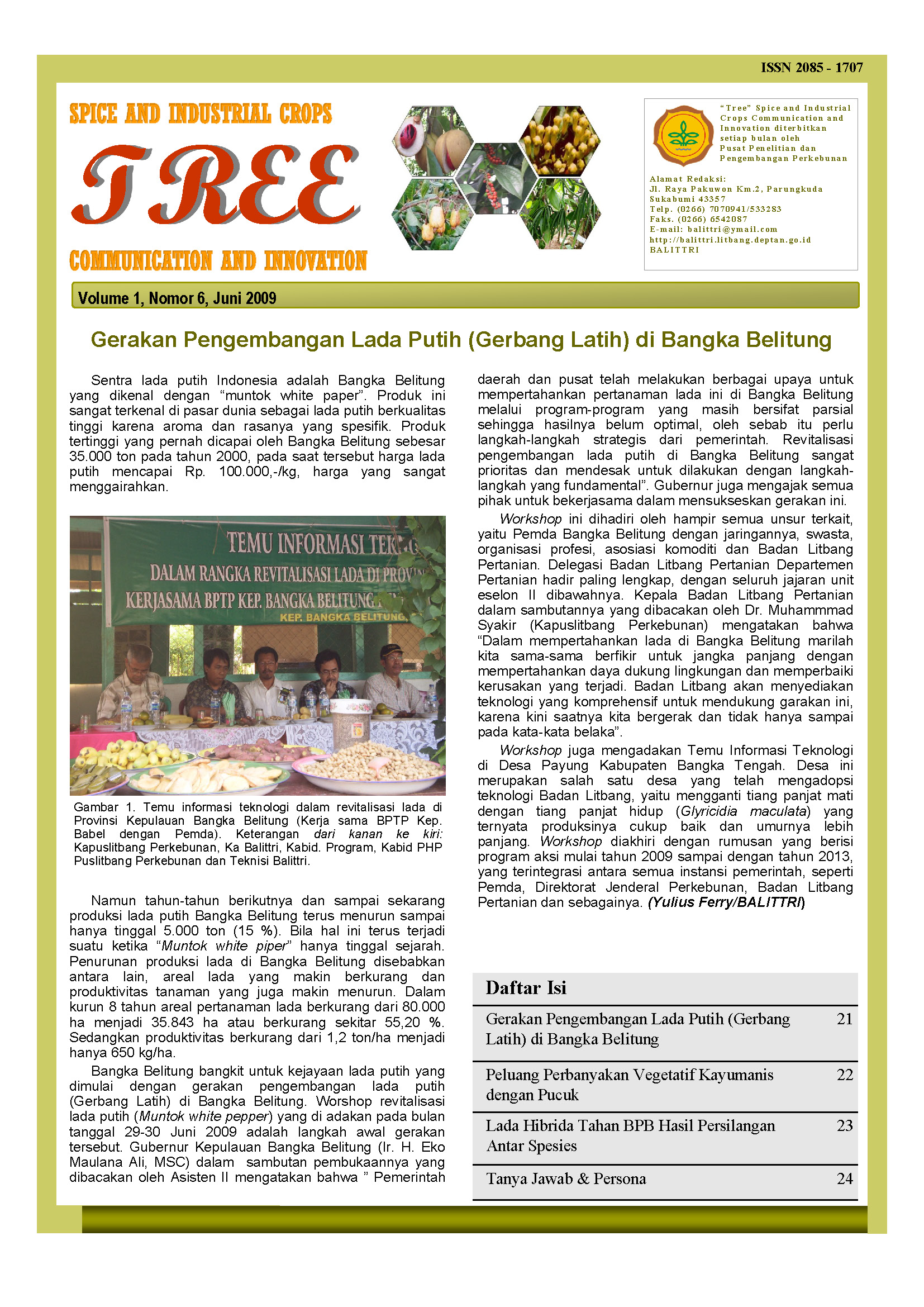 | Catatan | Gerakan Pengembangan Lada Putih (Gerbang Latih) di Bangka Belitung Peluang Perbanyakan Vegetatif Kayumanis dengan Pucuk Lada Hibrida Tahan BPB Hasil Persilangan Antar Spesies Tanya Jawab & Persona |