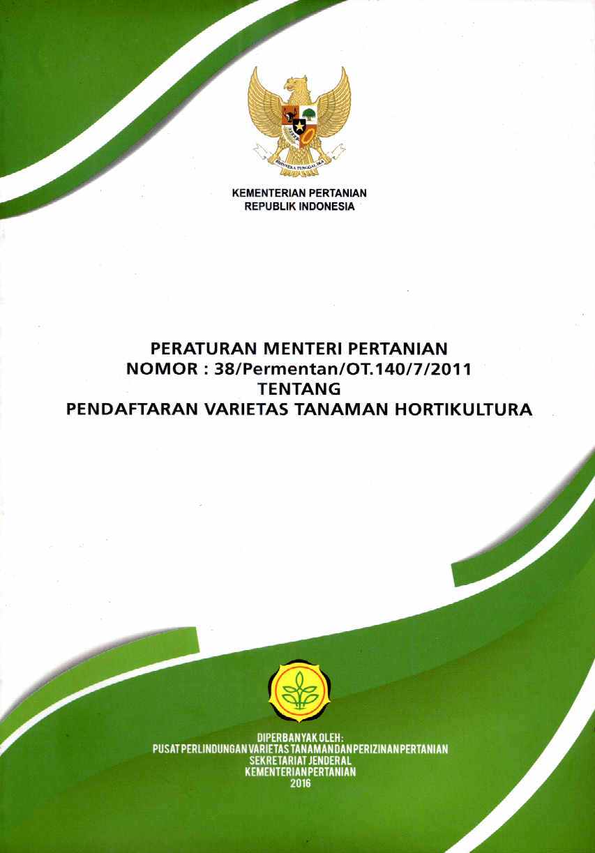 | Judul | Peraturan menteri pertanian nomor : 38/Permentan/OT.140/7/2011 tentang pendaftaran varietas tanaman hortikultura / Pusat Perlindungan Varietas Tanaman dan Perizinan Pertanian |