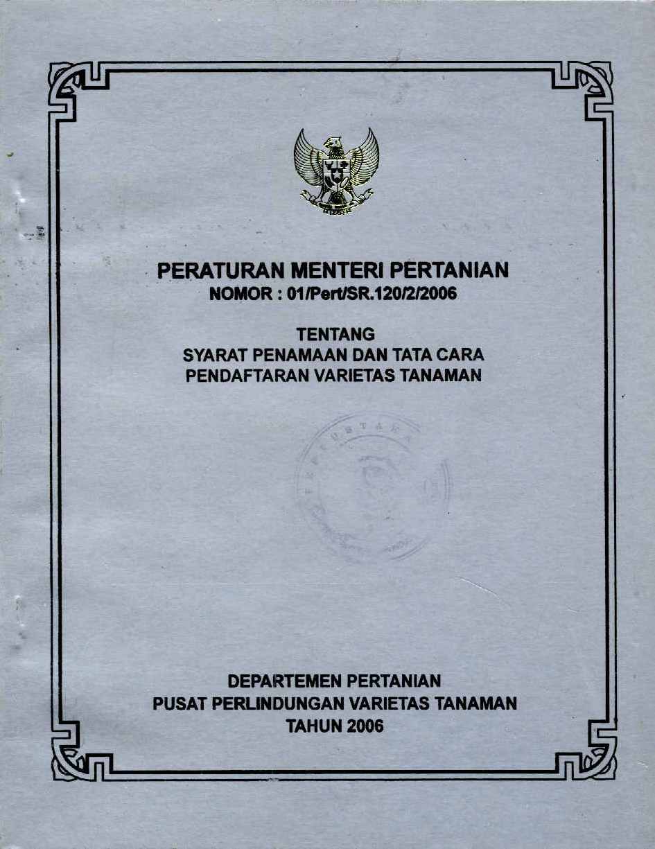 | Judul | Peraturan Menteri Pertanian nomor : 01/Pert/SR.120/2/2006 tentang syarat penamaan dan tata cara pendaftaran varietas tanaman / Departemen Pertanian |