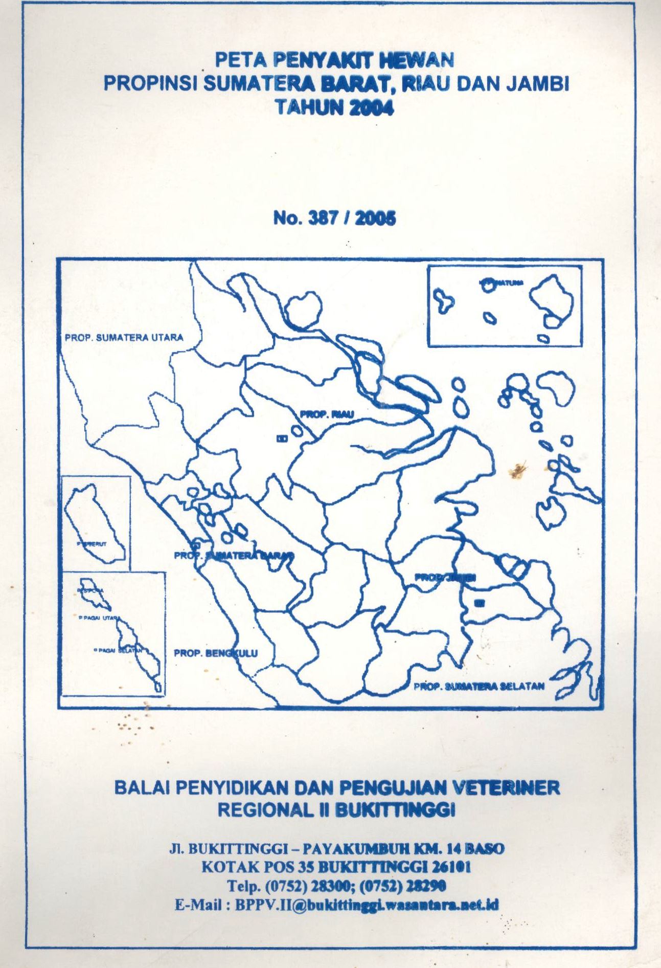 | Judul | Peta penyakit hewan Propinsi Sumatera Barat, Riau dan Jambi tahun 2004 / Balai Penyidikan dan Pengujian Veteriner Regional II Bukittinggi |