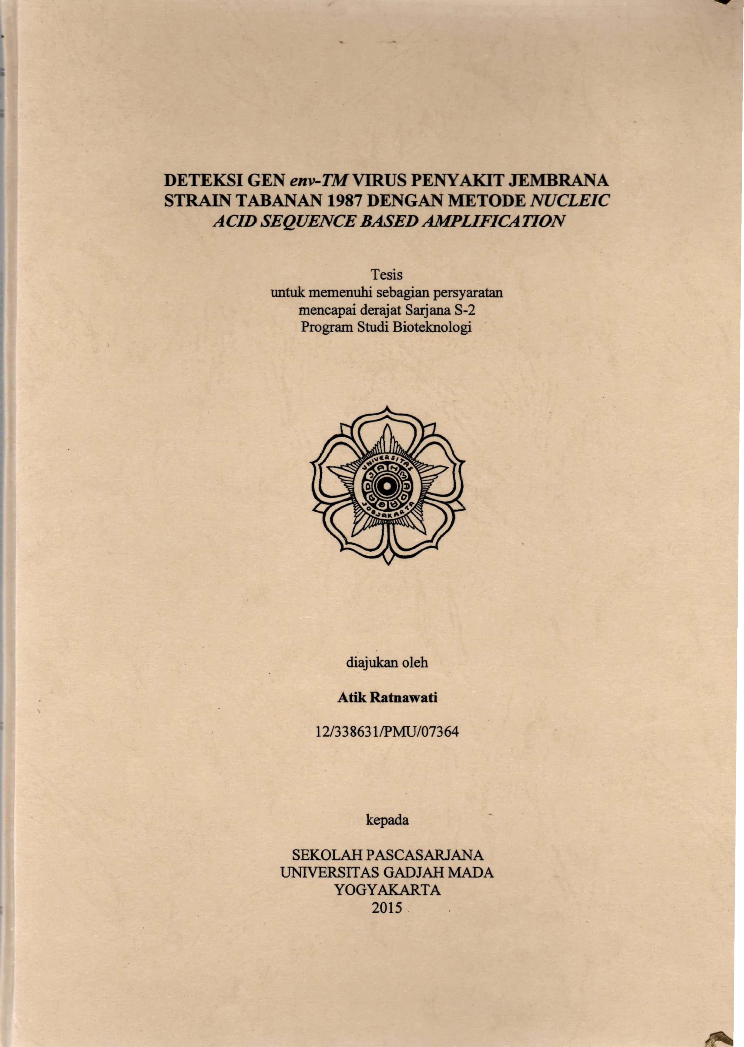 Judul Deteksi Gen env-TM Virus PenyakitJembrana Strain Tabanan 1987 dengan Metode Nucleic Acid Sequence Based Amplification / Ratnawati, Atik