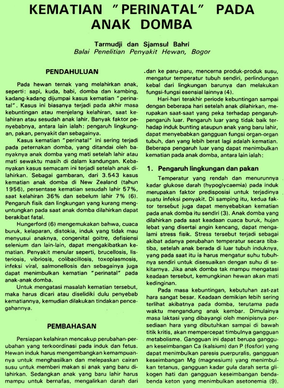 | Judul | Kematian perinatal pada anak domba / TARMUDJI; BAHRI, Sjamsul(Balai Penelitian Veteriner, Bogor (Indonesia)). |