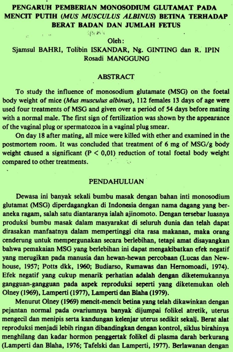 | Judul | Pengaruh pemberian monosodium glutamat pada mencit putih (Mus musculus albinus) betina terhadap berat badan dan jumlah fetus. / Bahri, Sjamsul; Iskandar, Tolibin; Ginting, Ngepkep(Lembaga Penelitian Penyakit Hewan)Ipin, R; Manggung, R. Ipin Rosadi(Fakultas Kedokteran Hewan), Bogor (Indonesia). |