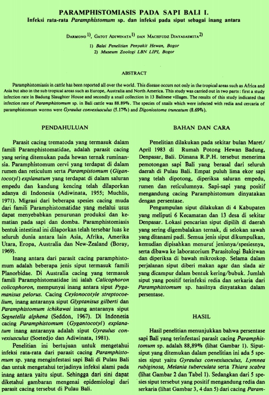 | 245 | # | # | $a Paramphistomiasis pada sapi Bali I. Infeksi rata-rata Paramphistomum sp. dan infeksi pada siput sebagai inang antara /$c Darmono; Adiwinata, Gatot (Balai Penelitian Penyakit Hewan, Bogor (Indonesia))Djayasasmita, Machfudz (Museum Zoologi LBN LIPI, Bogor (Indonesia)). |