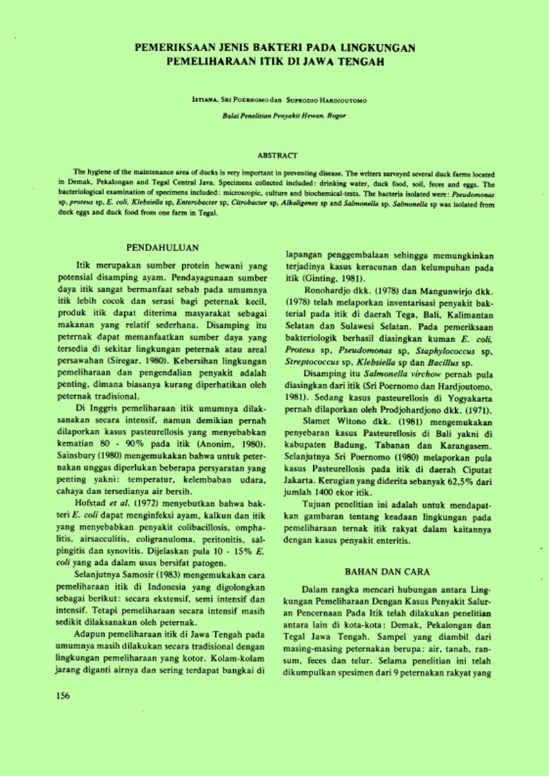 | Judul | Pemeriksaan jenis bakteri pada lingkungan pemeliharaan itik di Jawa Tengah. / ISTIANA; POERNOMO, Sri; HARDJOUTOMO, Suprodjo(Balai Penelitian Penyakit Hewan, Bogor (Indonesia)). |