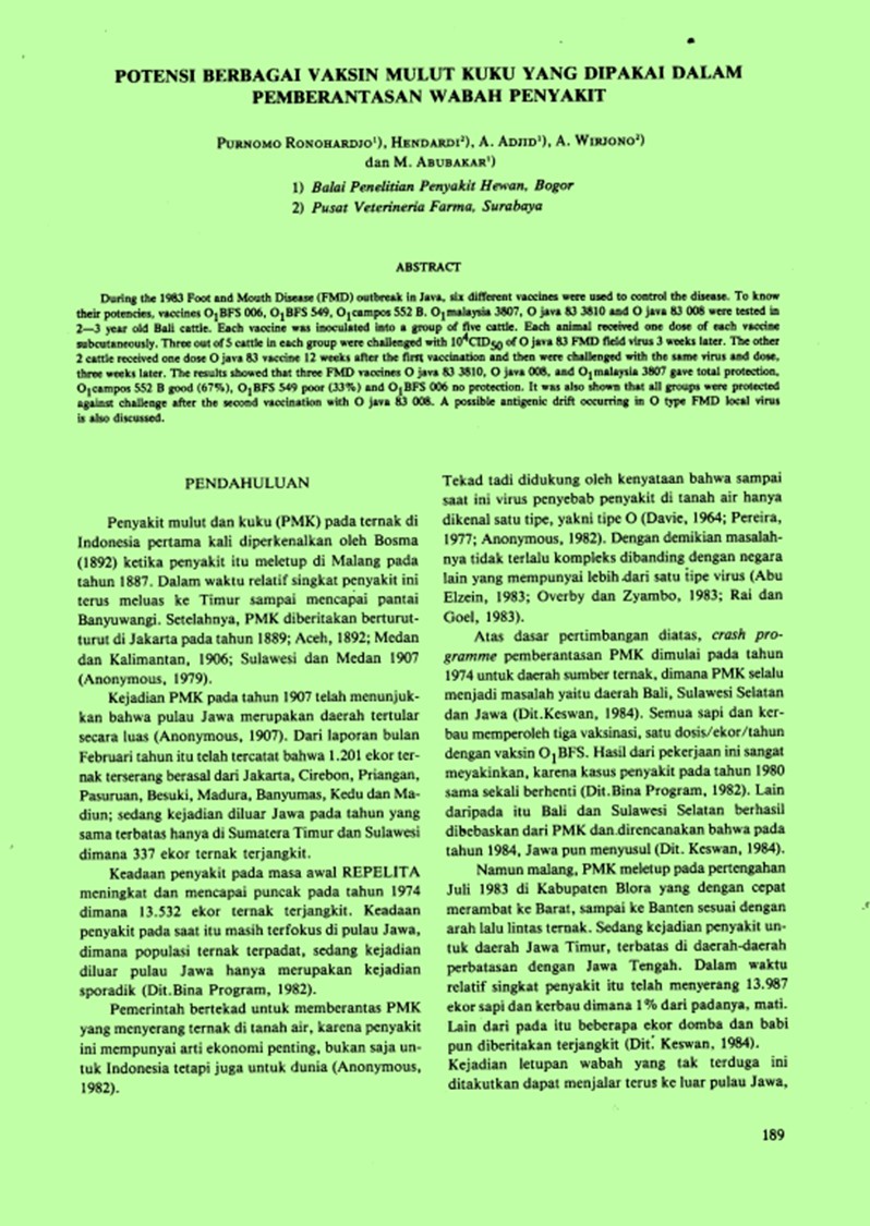 | Pengarang | ADJID, R.M. Abdul ABUBAKAR, Makdum(Balai Penelitian Penyakit Hewan, Bogor (Indonesia)) HENDARDI WIRYONO, A.(Pusat Veterinaria Farma, Surabaya (Indonesia)). |