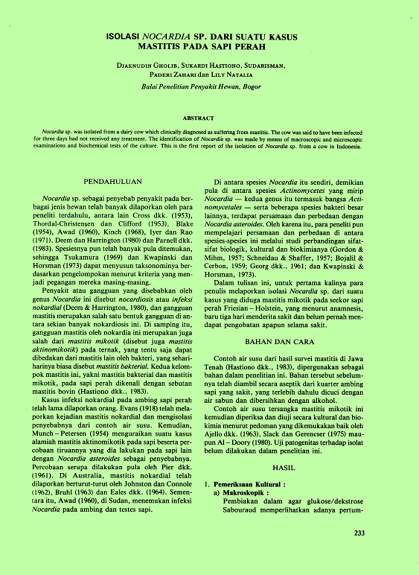 | Judul | Isolasi Nocardia sp. dari suatu kasus Mastitis pada sapi perah. / Gholib, Djaenudin; Hastiono, Sukardi; Sudarisman; Zahari, Paderi; Natalia, Lily (Balai Penelitian Penyakit Hewan, Bogor (Indonesia)). |