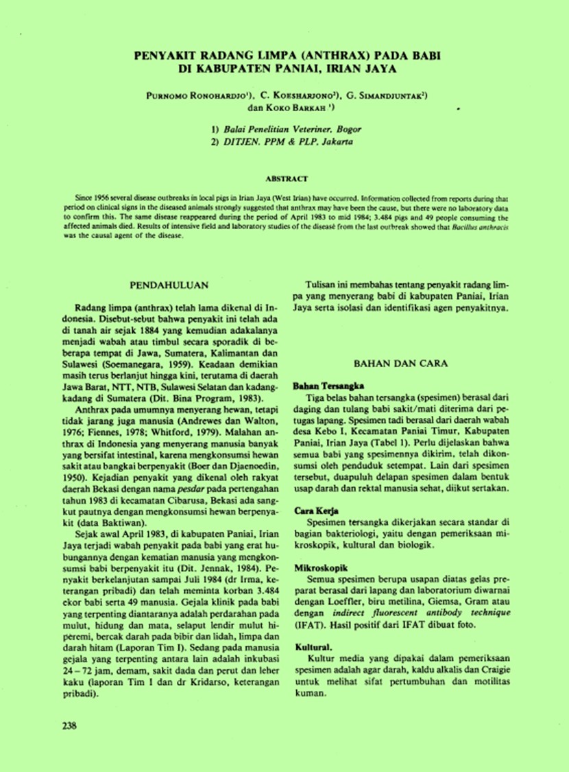 | Judul | Penyakit radang limpa (Anthrax) pada babi di Kabupaten Paniai, Irian Jaya. / RONOHARDJO, Purnomo; BARKAH, Koko (Balai Penelitian Penyakit Hewan, Bogor (Indonesia)) KOESHARJONO, C.; SIMANDJUNTAK, Gindo M. (Ditjen PPM PLP Jakarta (Indonesia)). " |