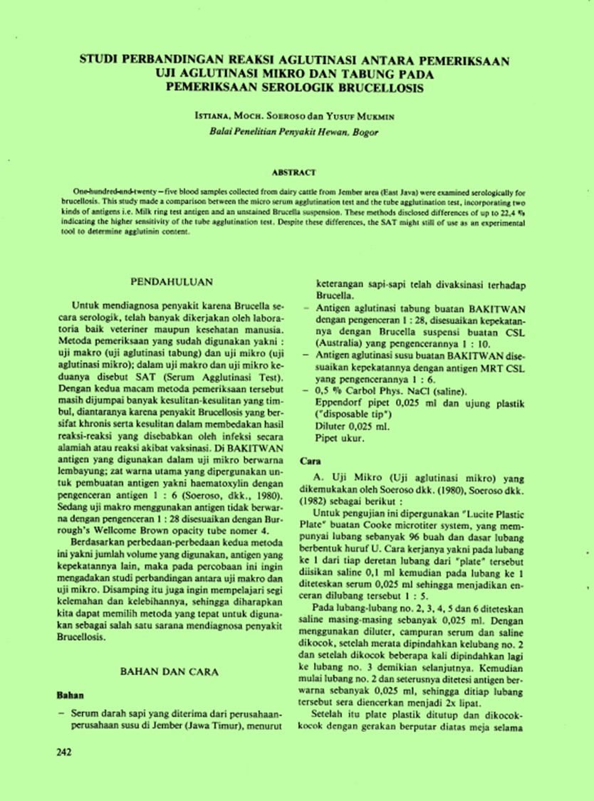 | Judul | Studi perbandingan reaksi aglutinasi antara pemeriksaan uji aglutinasi mikro dan tabung pada pemeriksaan serologik Brucellosis. / ISTIANA; SOEROSO, Moch; MUKMIN, Yusuf (Balai Penelitian Penyakit Hewan, Bogor (Indonesia)). |