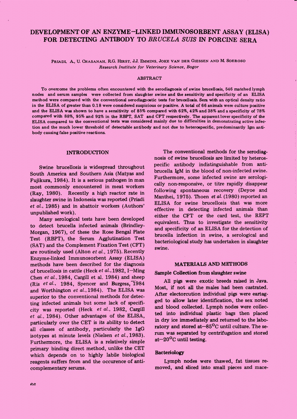 | 245 | # | # | $a Development of an enzyme-linked immunosorbent assay (ELISA) for detecting antibody to Brucela suis in porcine sera. /$c Priadi, Adin; Chasanah, A.U.; Hirst, Ribert G.; Emmins, J.; Giessen, Joke Van Der; Soeroso, Moch (Research Institute for Veterinary Science, Bogor (Indonesia)). |
