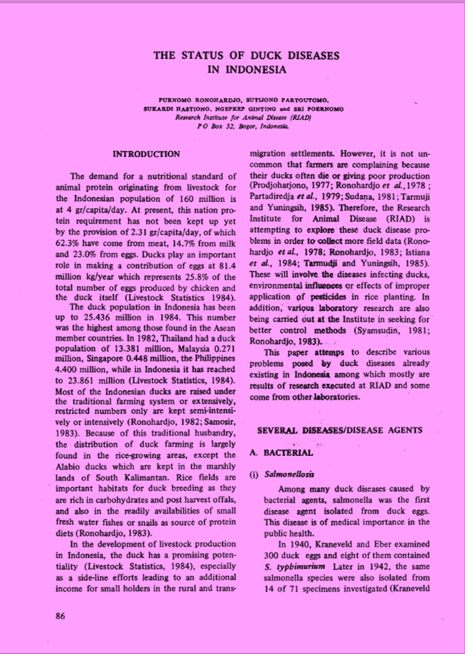 | Judul | The status of duck disease in Indonesia / Ronohardjo, Purnomo; Partoutomo, Sutijono; Hastiono, Sukardi; Ginting, Ngepkep; Poernomo, Sri |