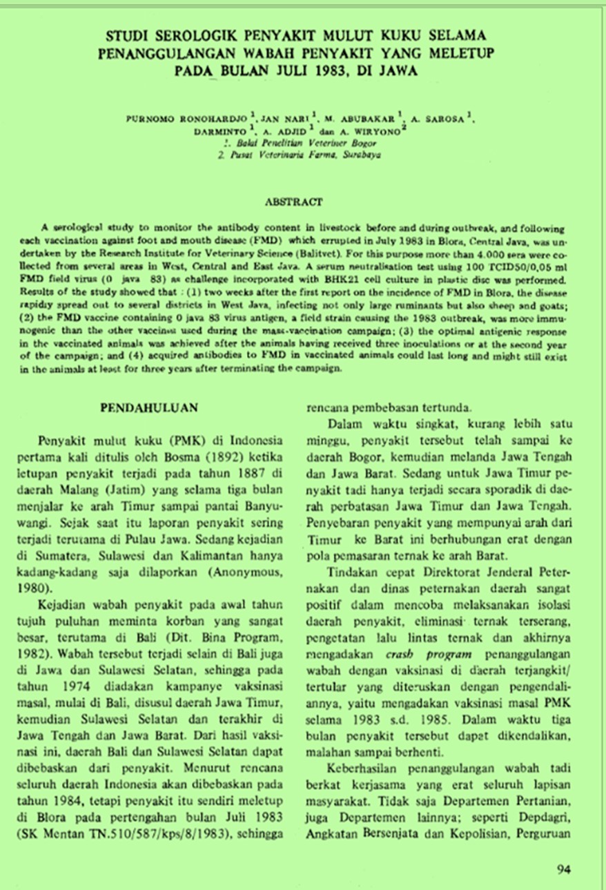| Judul | Studi Serologik Penyakit Mulut Kuku Selama Penanggulangan Wabah Penyakit Yang Meletup Pada Bulan Juli 1983, di Jawa / Ronohardjo, Purnomo; Nari, Jan; Abubakar, Makdum; Sarosa, Antonius; Darminto; Adjid, R.M. Abdul; Wiryono, A. |