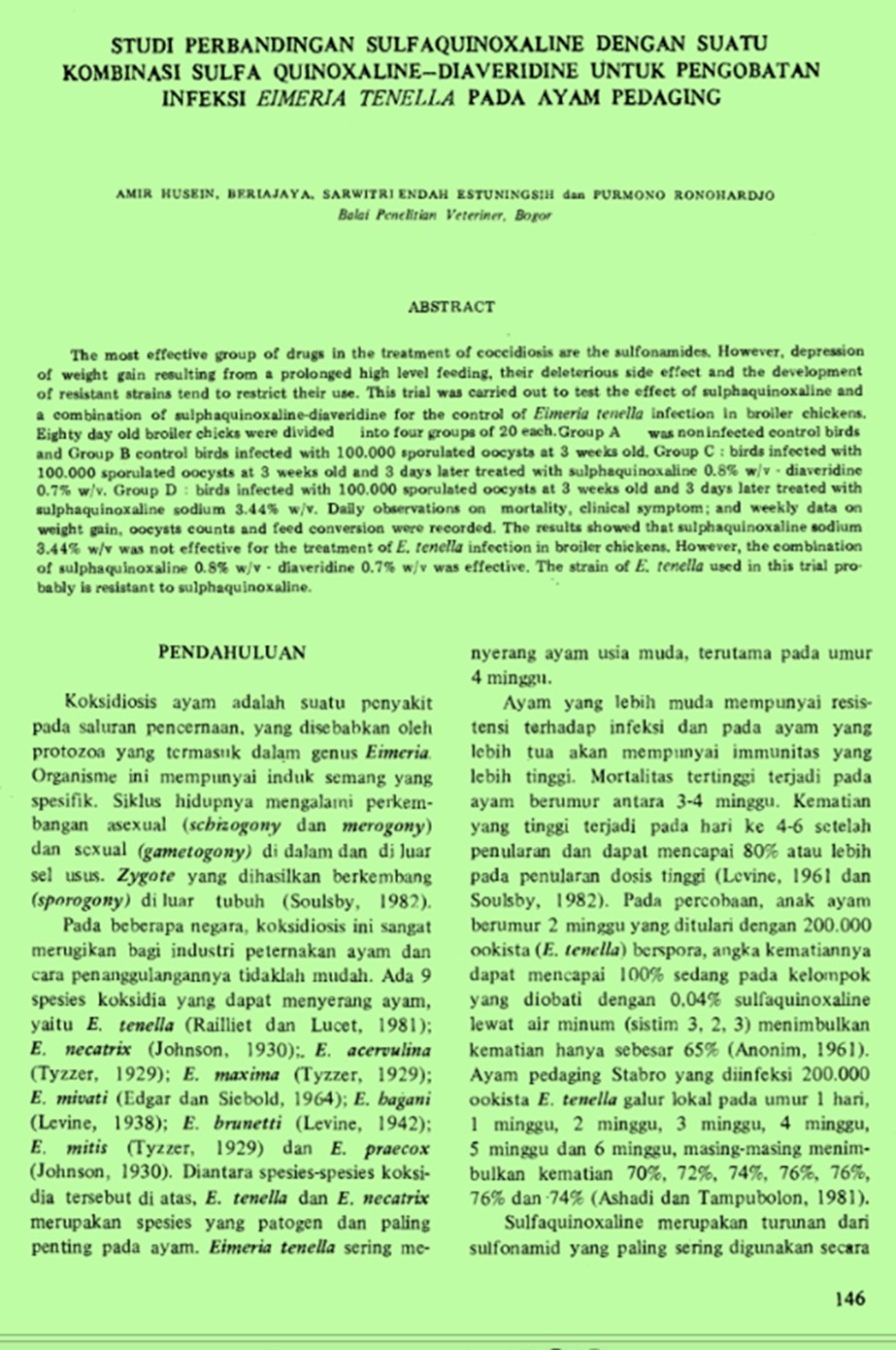 | Judul | Studi Perbandingan Sulfaquinoxaline Dengan Suatu Kombinasi Sulfa Quinoxaline-Diaveridine Untuk Pengobatan Infeksi Eimeria Tenella Pada Ayam Pedaging / Husein, Amir; Beriajaya; Estuningsih, Sarwitri Endah; Ronohardjo, Purnomo |