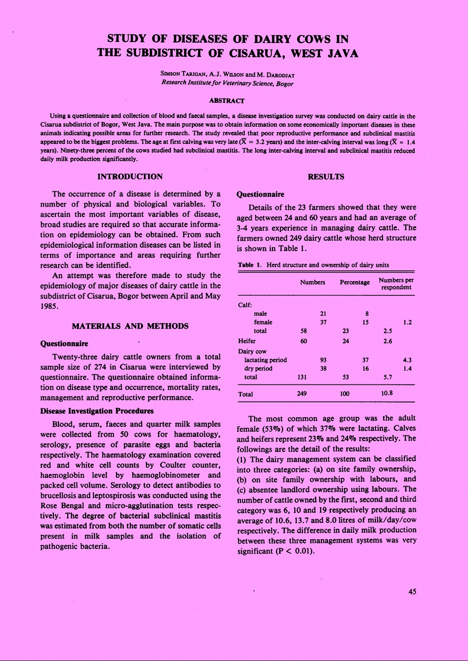 | Judul | Study of diseases of dairy cows in the subdistrict of Cisarua, West Java / Tarigan, Simson; Wilson, A.J.; Darodjat, M. (Research Institute for Veterinary Science, Bogor (Indonesia)). |