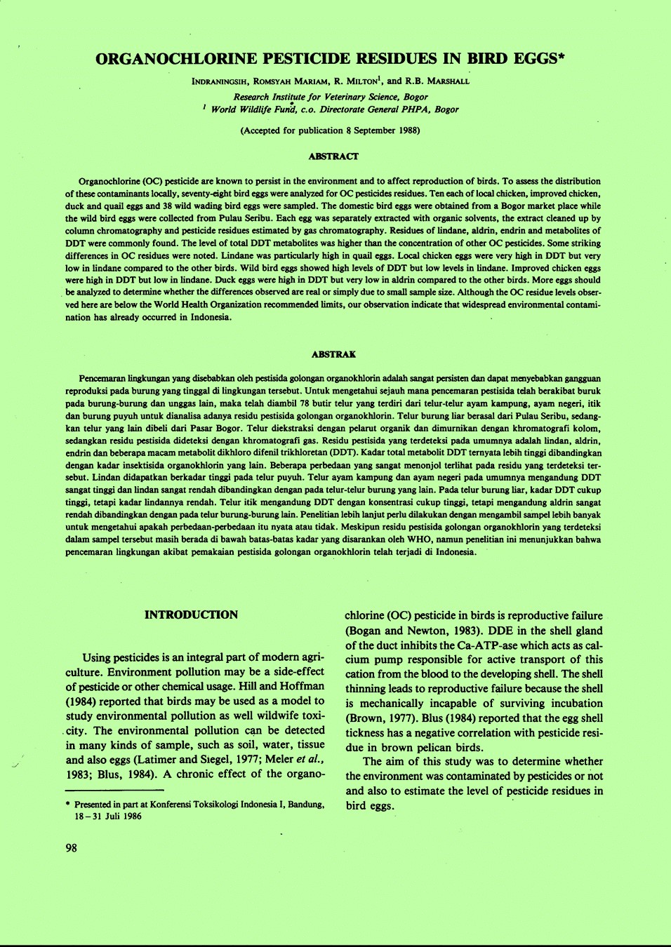 | Judul | Organochlorine pesticide residues in bird eggs / Indraningsih; Maryam, Romsyah; Marshall, Rex(Balai Penelitian Veteriner, Bogor (Indonesia))Milton, R. (World Wildlife Fund, c.o. Directorate General PHPA, Bogor). |