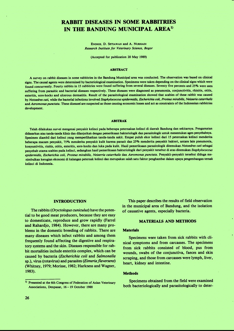 | Judul | Rabbit diseases in some rabbitries in the Bandung municipal area / Setiawan, Endhie D.; Nurhadi, Agus(Research Institute for Veterinary Science, Bogor (Indonesia)). |