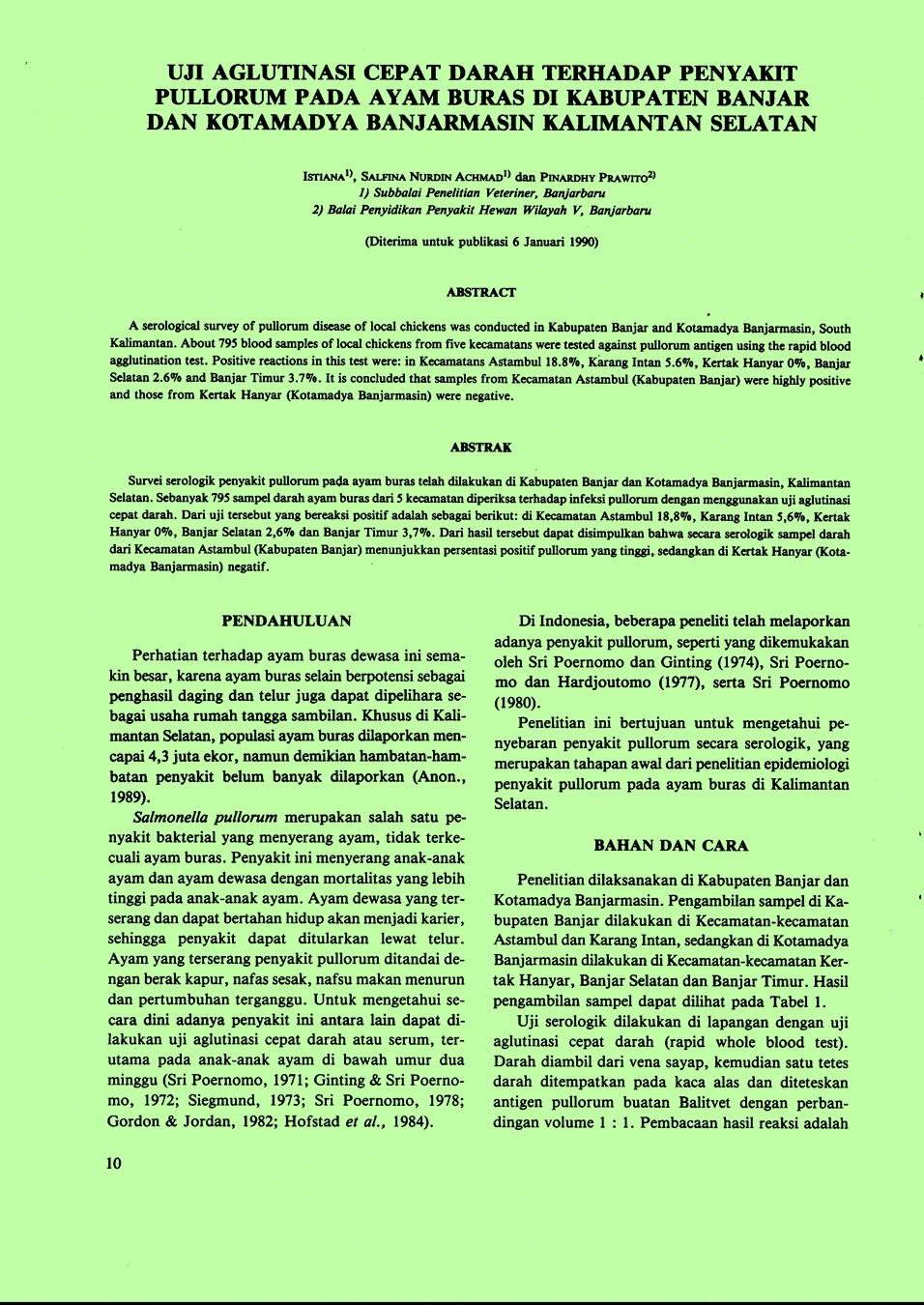 | Pengarang | Achmad, Salfina Nurdin(Sub Balai Penelitian Veteriner, Banjarbaru (Indonesia))Prawito, Pinardhy(Balai Penyidikan Hewan Wilayah V, Banjarbaru (Indonesia)). |