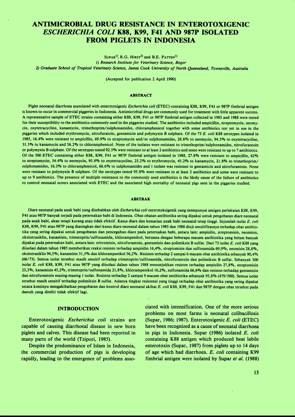 | Judul | Antimicrobial drug resistance in enterotoxigenic Escherichia coli K88, K99, F41 and 987P isolated from piglets in Indonesia. / Supar; Patten, Barry(Research Institute for Veterinary Science, Bogor (Indonesia))Hirst, Ribert G. (Graduate School of Tropical Veterinary Science, James Cook University of North Queensland, Townsville, Australia). |
