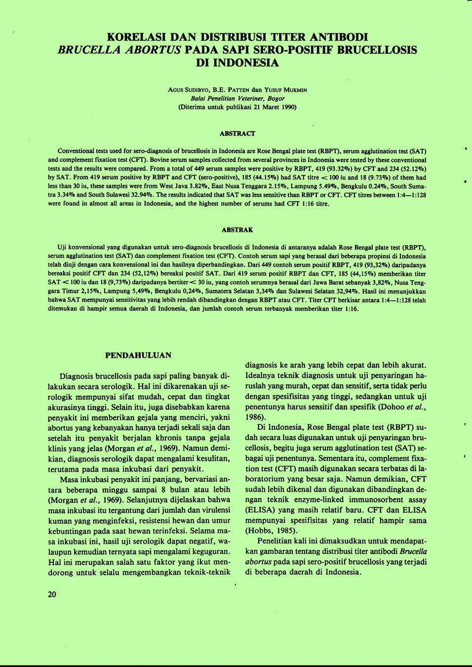 | 245 | # | # | $a Korelasi dan distribusi titer antibodi Brucella abortus pada sapi sero-positif brucellosis di Indonesia. /$c Sudibyo, Agus; Patten, Barry; Mukmin, Yusuf(Balai Penelitian Veteriner, Bogor (Indonesia)). |