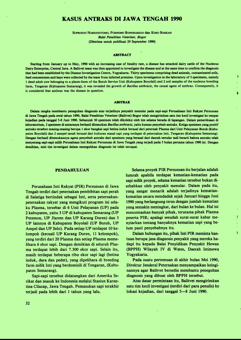 | Judul | Kasus antraks di Jawa Tengah 1990. / Hardjoutomo, Suprodjo; Ronohardjo, Purnomo; Barkah, Koko(Balai Penelitian Veteriner, Bogor (Indonesia)). |