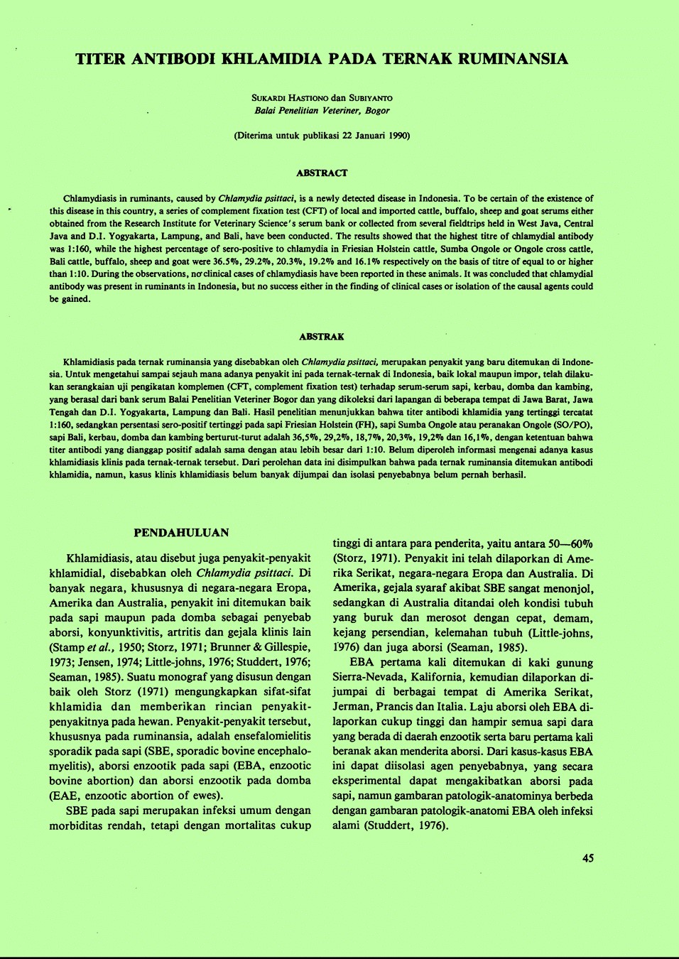 | Judul | Titer antibodi khlamidia pada ternak ruminansia. / Hastiono, Sukardi; Subiyanto(Balai Penelitian Veteriner, Bogor (Indonesia)). |